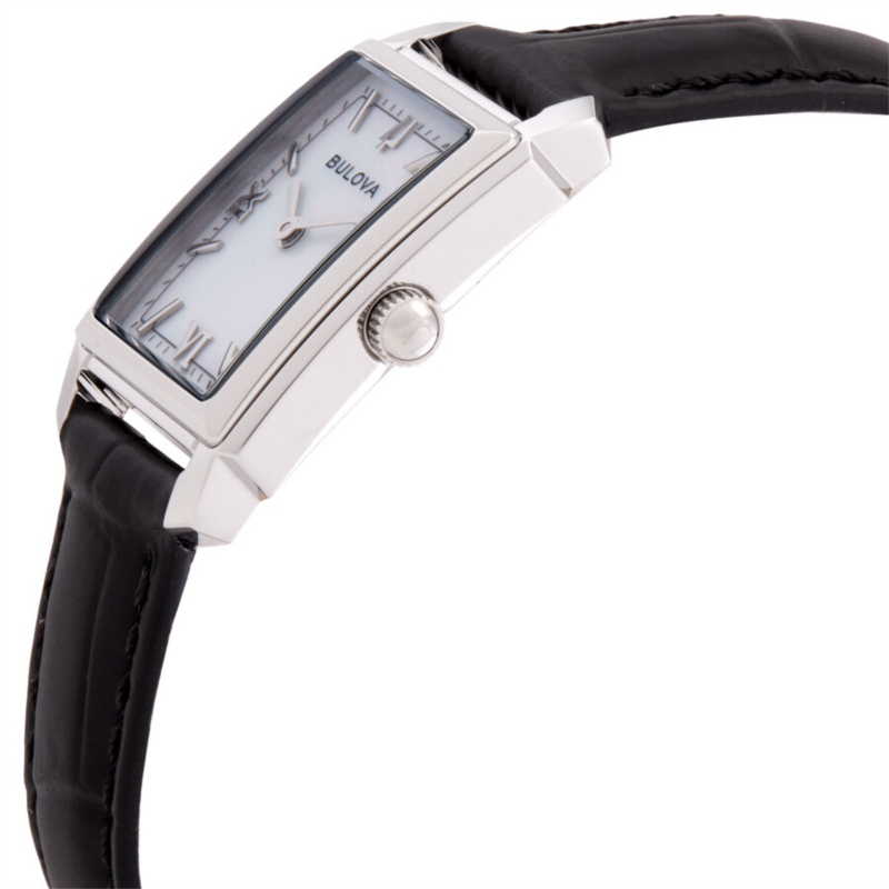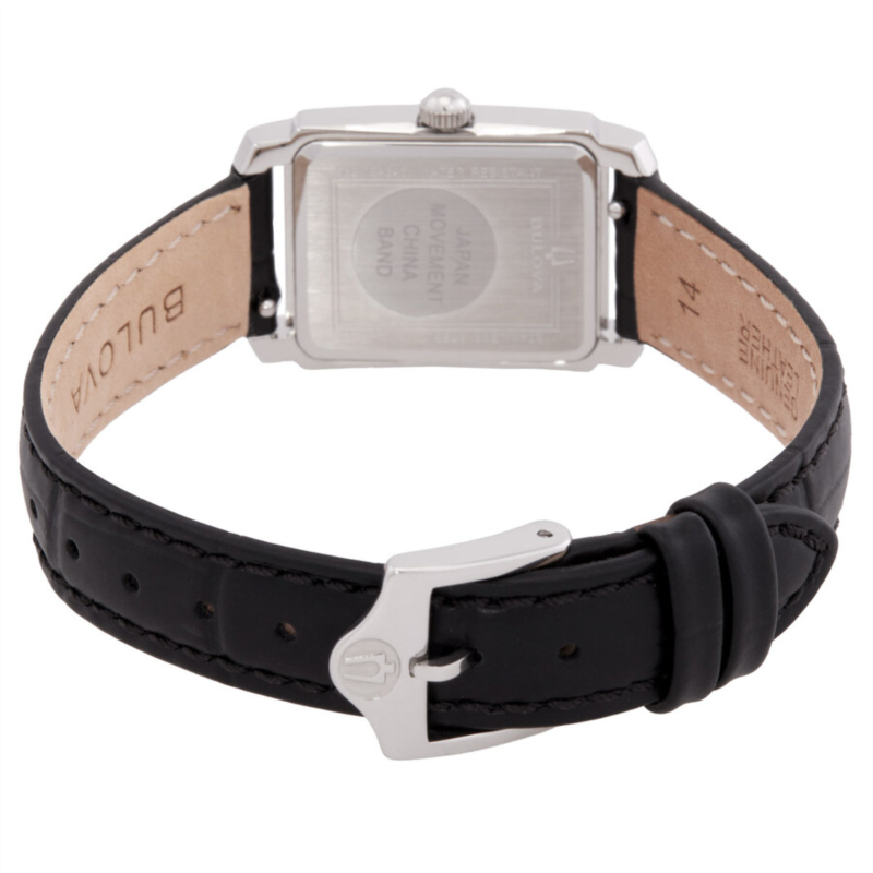 Silver-tone stainless steel case with a black leather strap. Fixed silver-tone stainless steel bezel. Mother of pearl dial with silver-tone hands and index-Roman numeral hour markers. Dial Type: Analog. Bulova Calibre GL22 quartz movement. Scratch resistant sapphire crystal. Solid case back. Rectangle case shape, case size: 21 mm, case thickness: 14 mm. Buckle clasp. Water resistant at 30 meters / 100 feet. Functions: hour, minute. Sutton Series. Sport watch style. Watch label: Swiss Made. Bulova Sutton Quartz Ladies Watch 96L330.