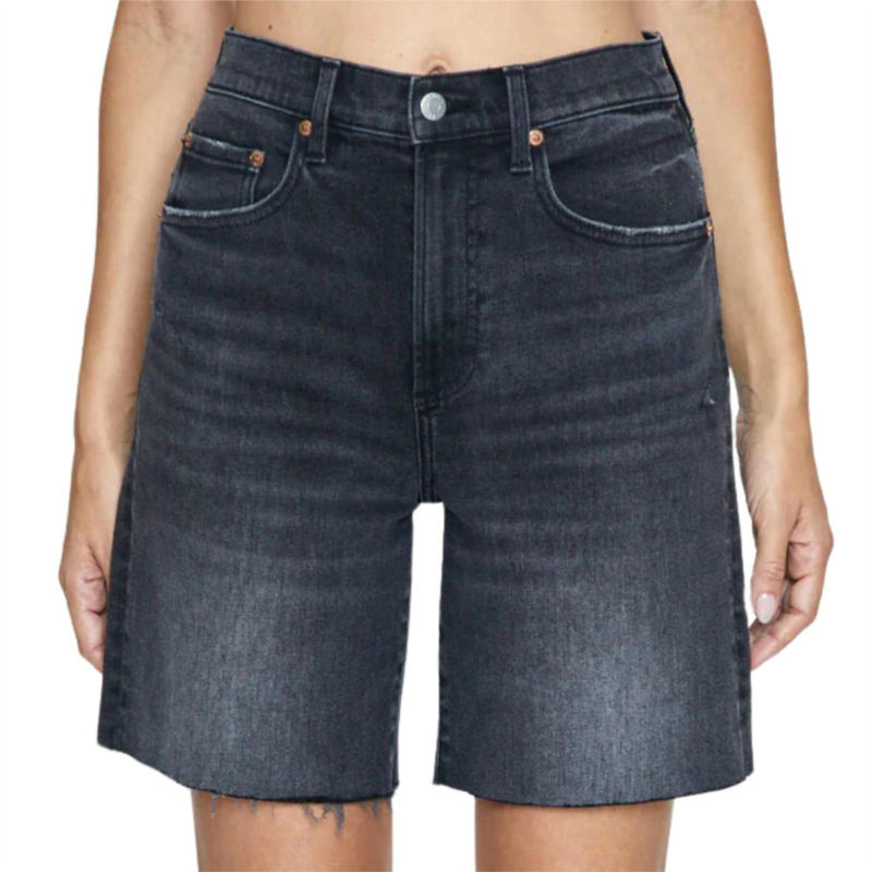 Fit to perfection, we love these high-waist shorts and you will too.Embrace effortless style with the Kaylee High Rise Short by Pistola, designed in Citadel Vintage washed black denim. These shorts feature an ultra-flattering 12 high-rise waist and a relaxed long loose-fit leg with an 8 inseam, accentuated by a raw edge hem for a laid-back vibe. Crafted from a blend of cotton and spandex, this comfort stretch denim offers fading and whiskering details, adding a vintage touch. Designed with a button closure and pockets, these shorts are perfect for summer outings and vacation days. Care - Wash cold.
