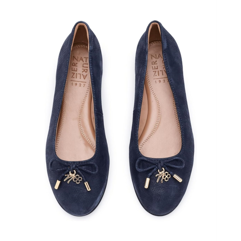- Graceful, polished, and made for all-day wear, the Naturalizer Ashlyn ballet flat blends timeless elegance with modern comfort. Crafted with a textured leather upper and a delicate decorative bow, it pairs with a soft faux leather lining, padded collar, and a cushioned ethylene vinyl acetate insole enhanced with Contour+ Comfort technology for supportive wear from day to night. Designed with an easy pull-on style closure in a sleek low-top silhouette with a classic round toe, it rests on a streamlined midsole with a subtle flat heel and is finished with a lightweight polyurethane outsole for flexible traction.