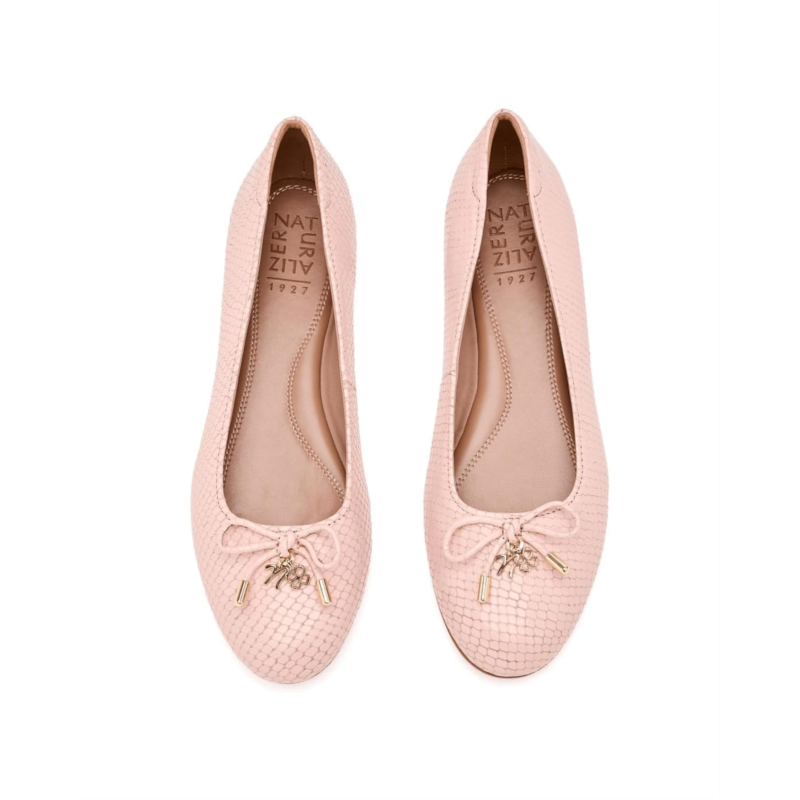 - Graceful, polished, and made for all-day wear, the Naturalizer Ashlyn ballet flat blends timeless elegance with modern comfort. Crafted with a textured leather upper and a delicate decorative bow, it pairs with a soft faux leather lining, padded collar, and a cushioned ethylene vinyl acetate insole enhanced with Contour+ Comfort technology for supportive wear from day to night. Designed with an easy pull-on style closure in a sleek low-top silhouette with a classic round toe, it rests on a streamlined midsole with a subtle flat heel and is finished with a lightweight polyurethane outsole for flexible traction.