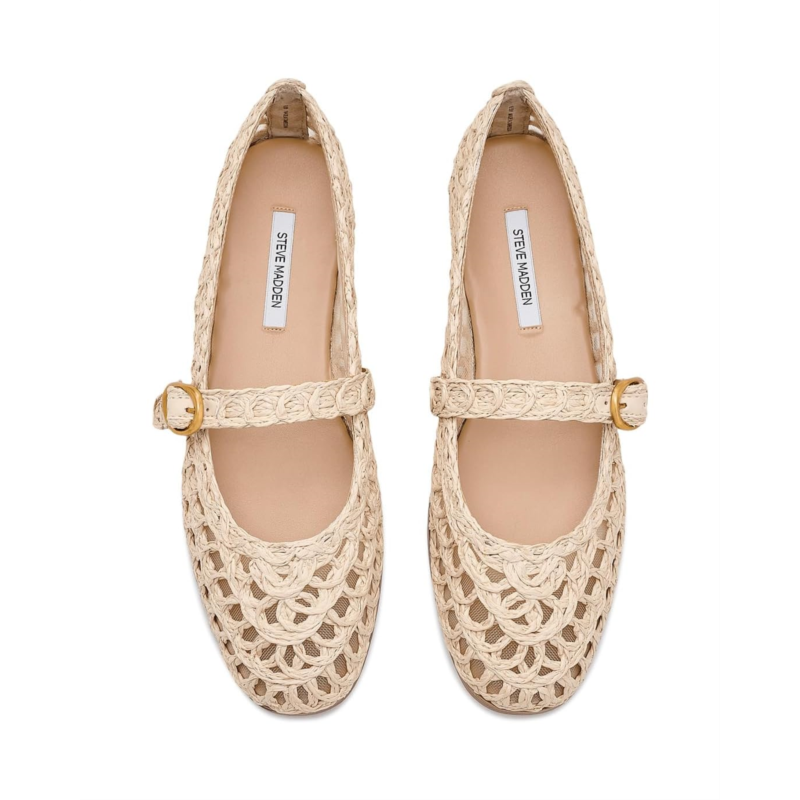 - Introducing the Melody ballet flat, exclusively from Steve Madden. Crafted with a raffia upper, this style offers a natural, textured look perfect for warm-weather wear. The nylon lining and insole provide lightweight comfort, while the buckle strap closure ensures an adjustable and secure fit.