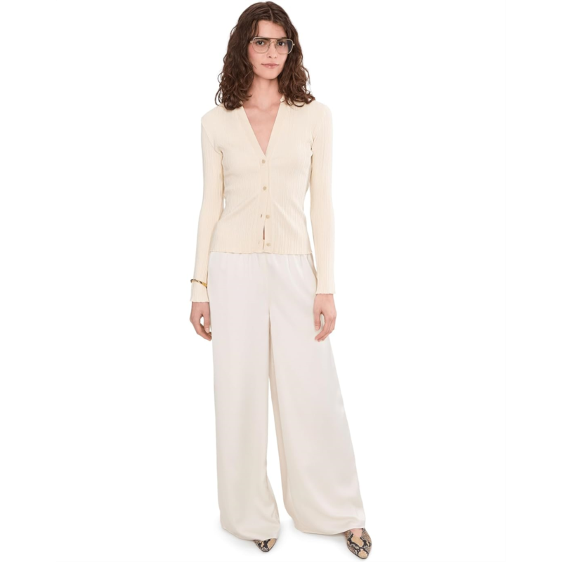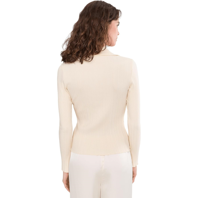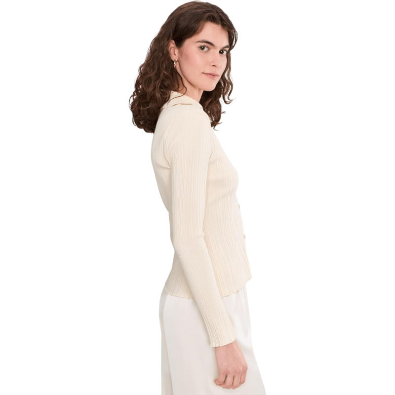 - Your new everyday statement piece, Vince Variegated Rib Polo. Crafted in a flattering slim fit, this polished piece hugs the silhouette beautifully while offering just the right amount of flexibility thanks to its sumptuous midweight fabric with a hint of stretch. The textured, variegated rib finish adds visual depth and dimension, giving this classic polo a modern, fashion-forward twist. Featuring a graceful collared V-neck with delicate scalloped-edge detailing, it delivers a subtle, feminine touch while maintaining timeless appeal. The button front closure allows versatile styling; wear it fully buttoned for a refined look or slightly open for a relaxed vibe. Long sleeves add warmth and sophistication, making it perfect for transitional seasons.