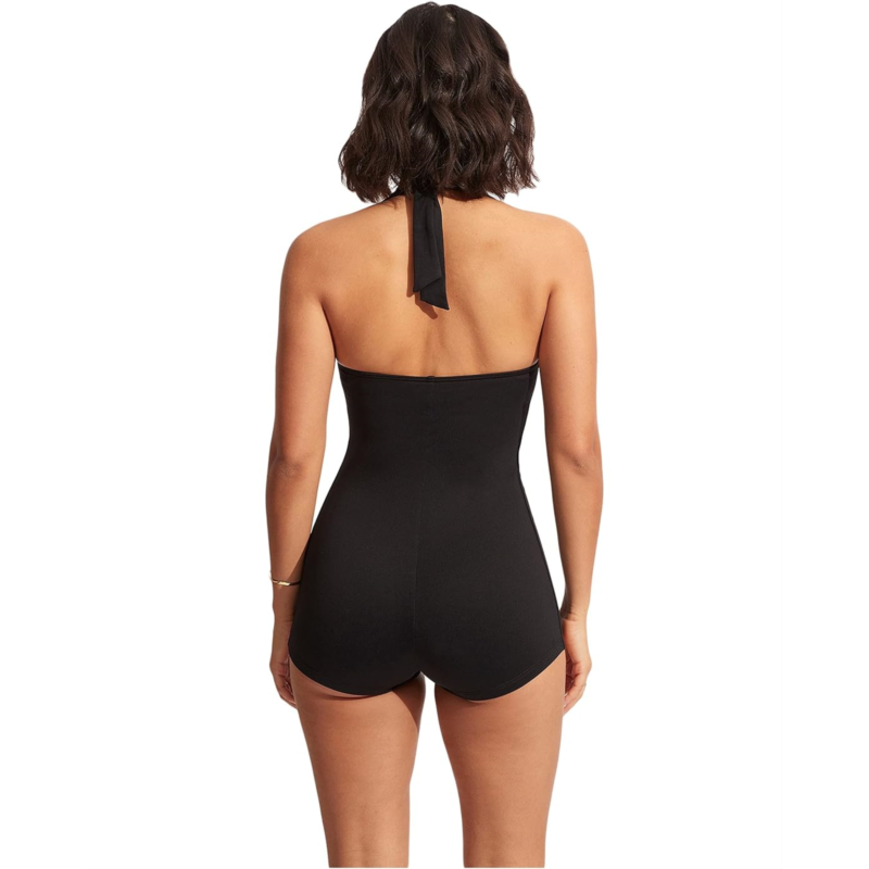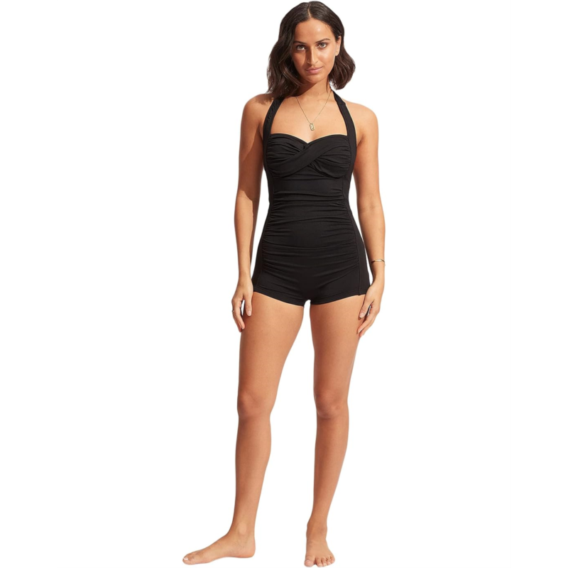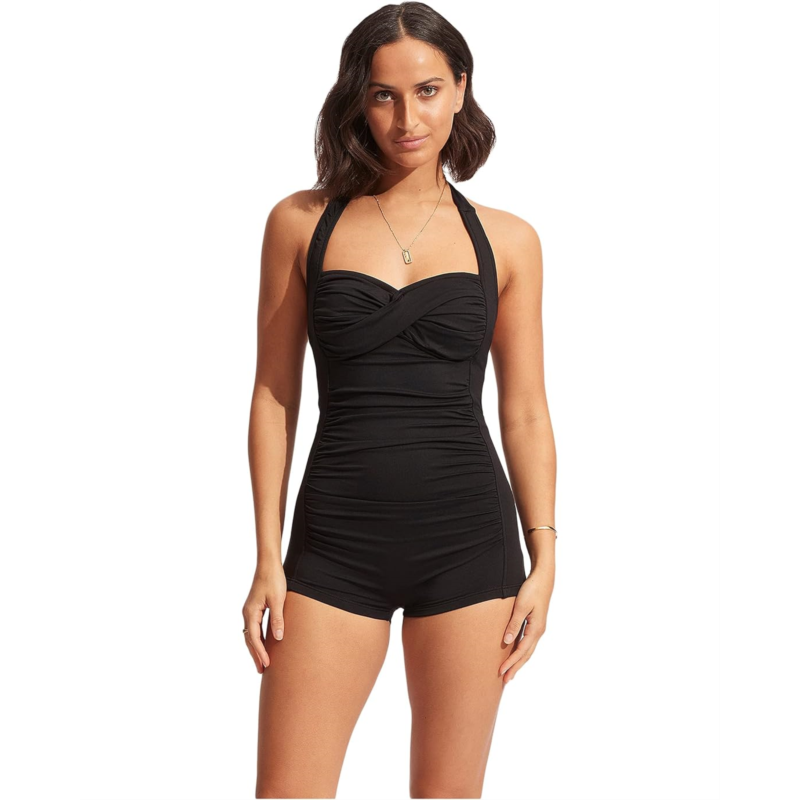 - Inspired by the vintage-era one-piece halter, the Seafolly Seafolly Collective Boyleg One-Piece is a modest style perfect for any occasion. This one-piece features a boy legline for maximum coverage, flattering gathered panel front, internal shelf bra for bust support, sewn in soft cups for shape and support, gripper tape at bustline to hold swimsuit in place, and adjustable soft tie halter.