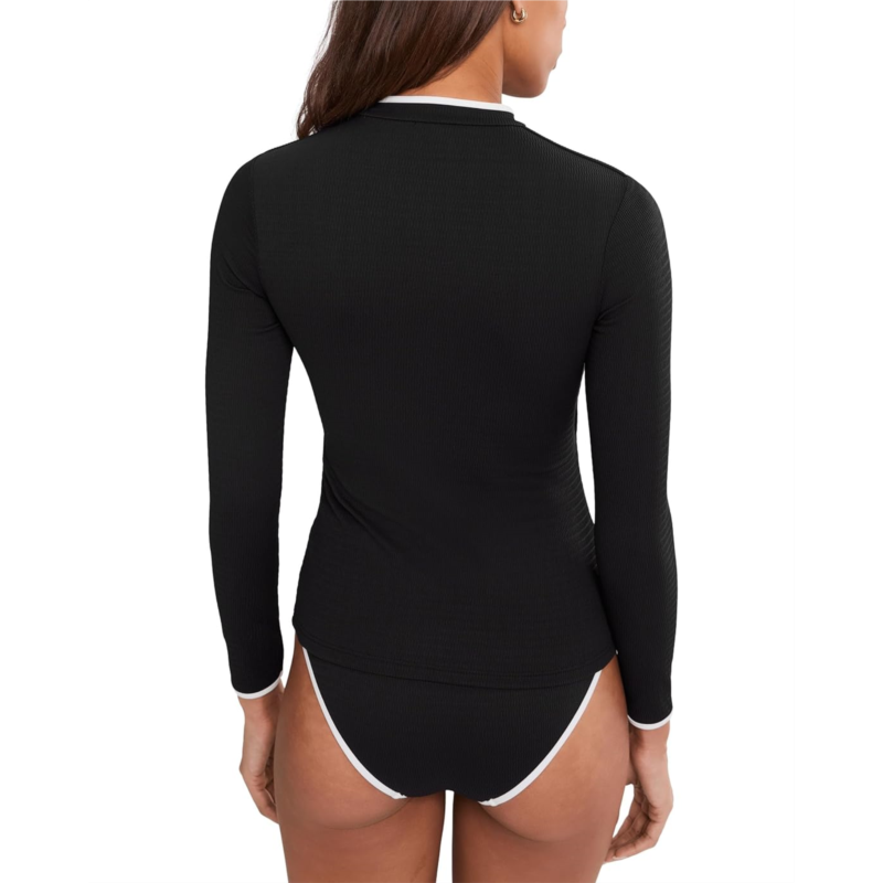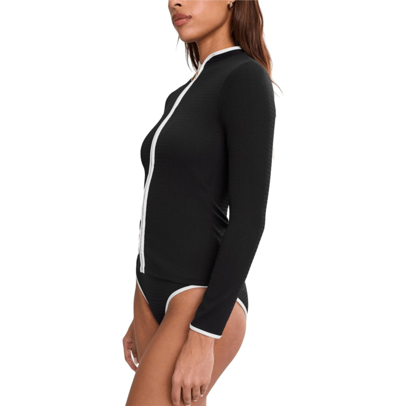 - The Seafolly Beach Bound Long Sleeve Sunvest is accented with a zip-front lock that allows versatile fit and sporty edge. The bold contrast binding and banded collar highlight the streamlined silhouette. It features removable cups for shape and support.