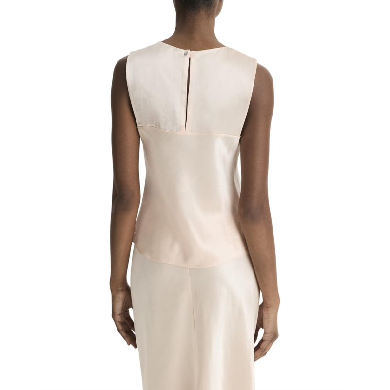 - Crafted from responsible Naia Renew acetate satin, the Vince Naia Shell accentuates a luxurious appeal. The pull-on style top features a crew neck, sleeveless design, back-button closure, and a bias-cut in standard length.