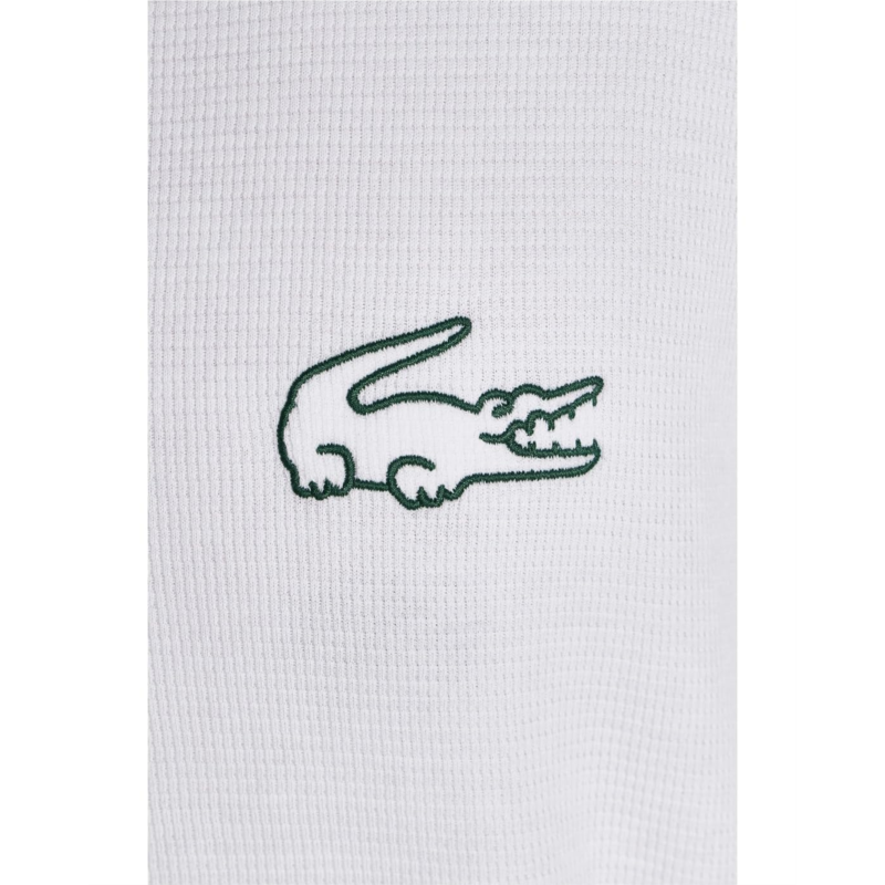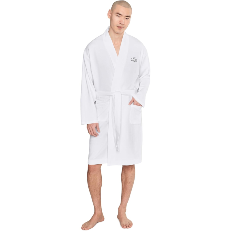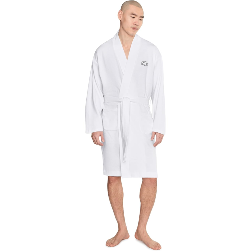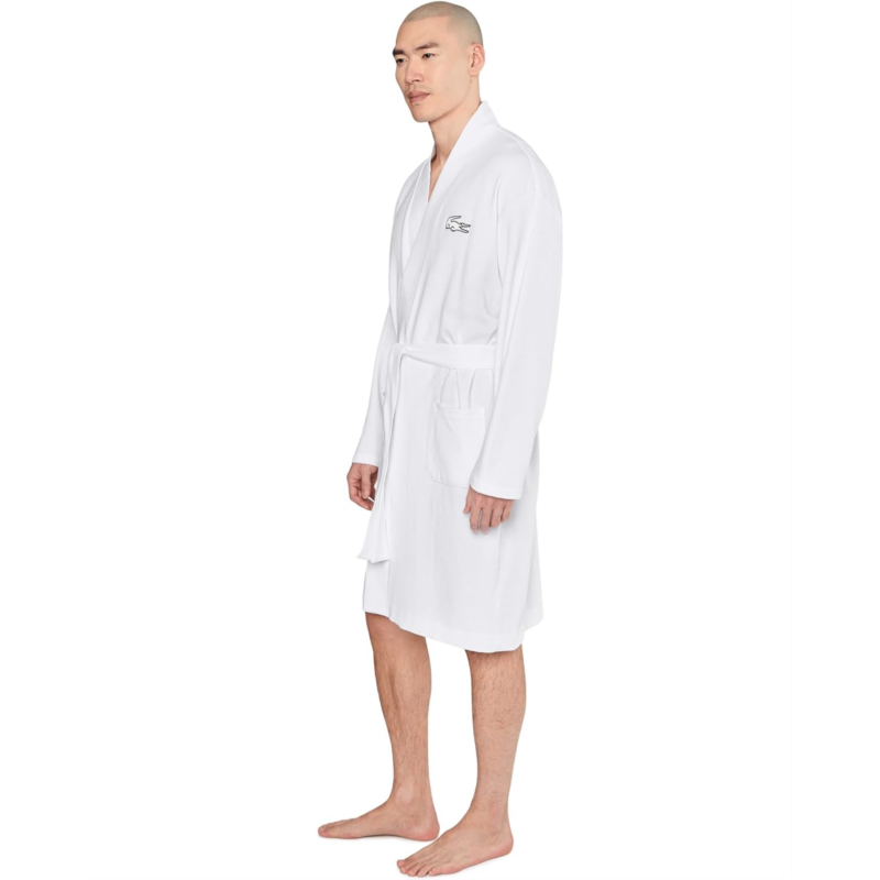 - Relax in style wearing the Lacoste Waffle Knit Robe made in soft cotton waffle to ensure a full comfortable silhouette. Crafted from soft cotton fabric, the robe features a V-neck with contrasted branded neck tape, long sleeves, embroidered crocodile logo at the left chest with contrasted outline, two patch pockets, and a belt detail to close or adjust the silhouette.