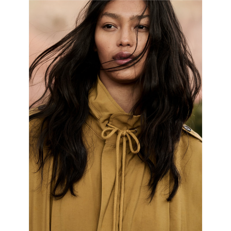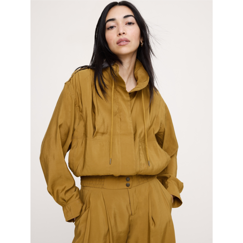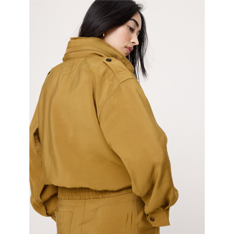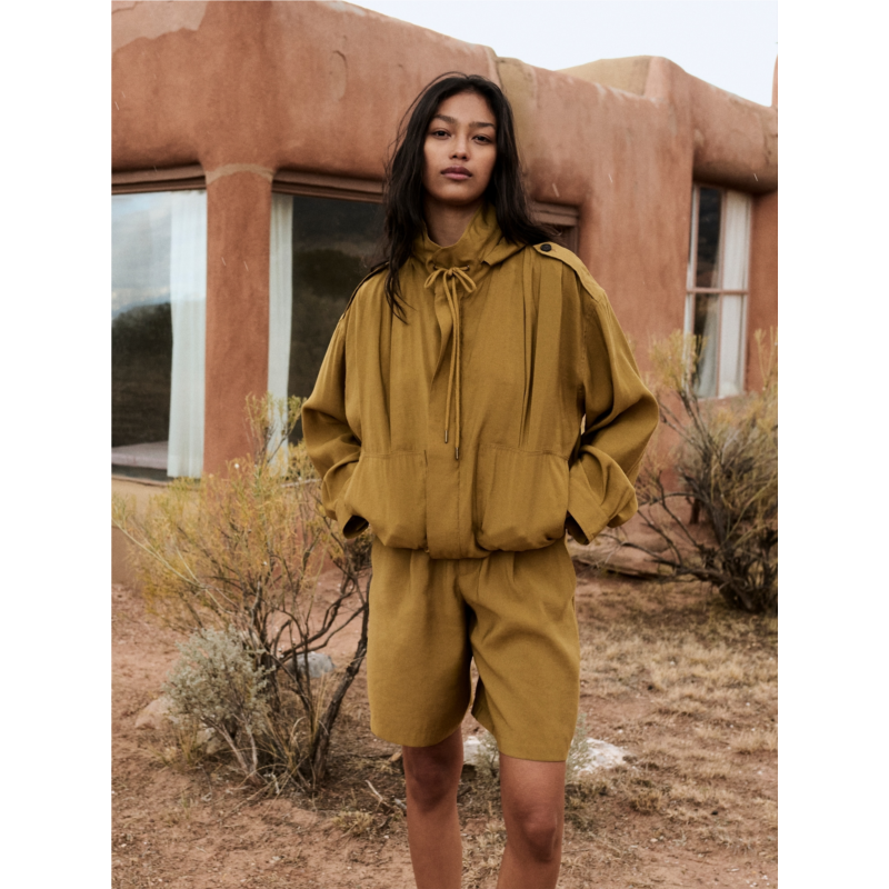- A light and flowing bomber jacket, just in time for warm weather. We kept the fit blousy, with a hidden hood and a light fabric we love for its understated shine.