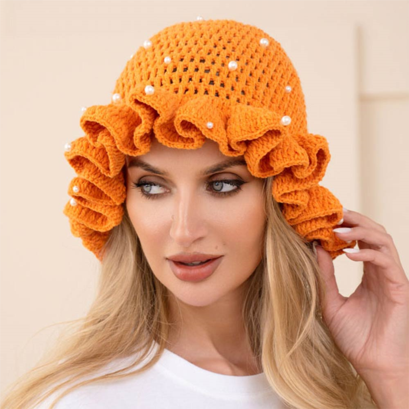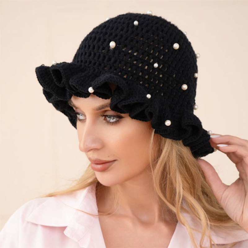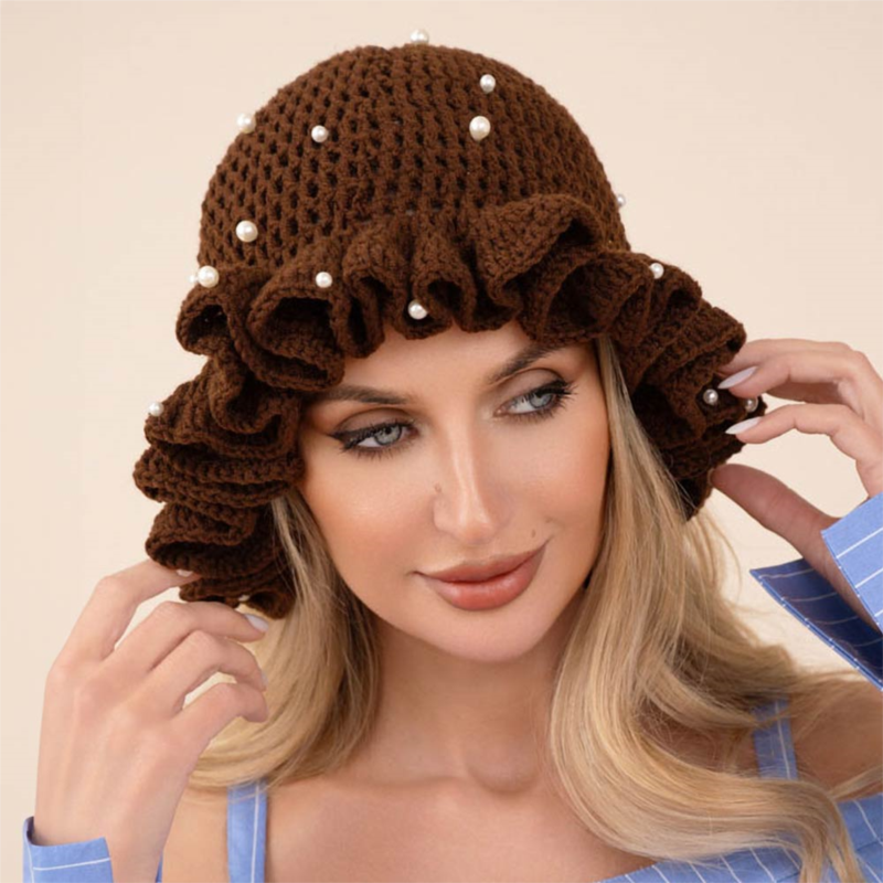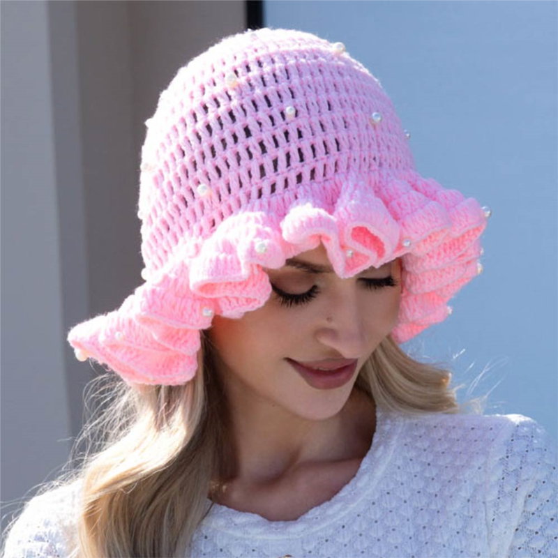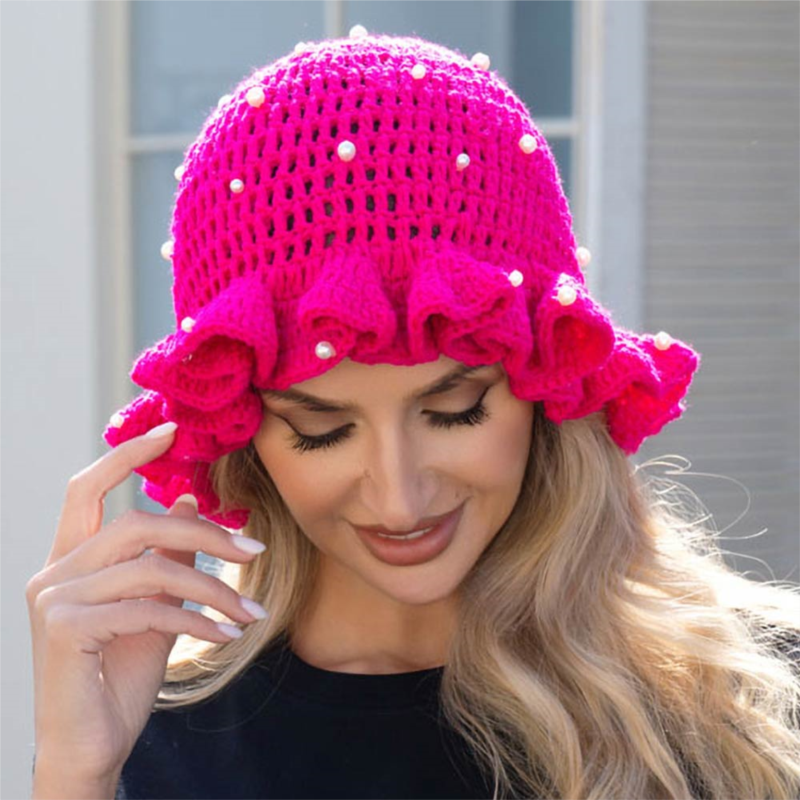 Size - 13.8'' X 9.1''Material - 100% PolyesterAdd chic texture to your look with this pearl accent ruffle knit bucket hat featuring delicate pearl embellishments and a soft ruffled brim. Perfect for casual outfits, seasonal styling, or trendy streetwear, this fashionable hat brings charm and stylish flair.