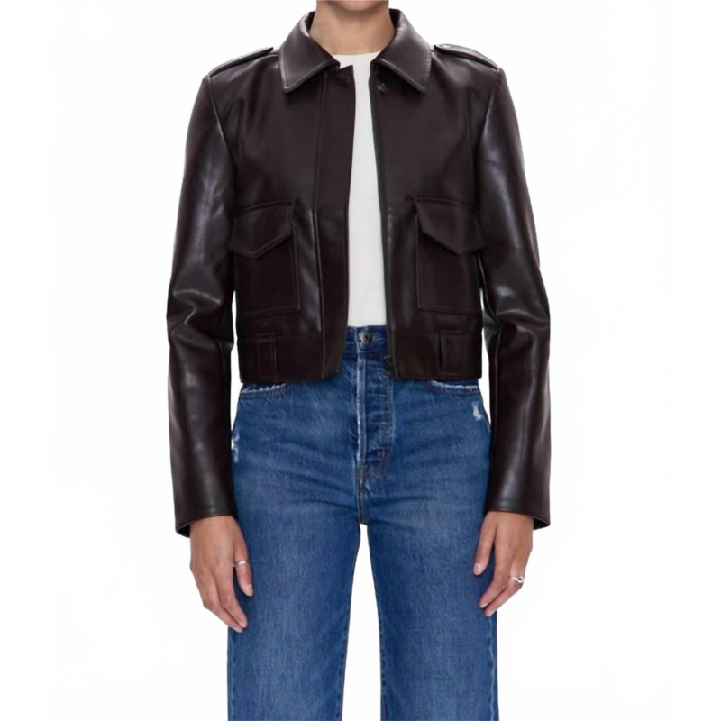 A leather jacket so good, it works with just about any outfit.Meet the PISTOLA Bex Shrunken Jacket, a stylish twist on the classic leather jacket for women. With its long sleeves and sleek cropped design, it brings an edgy flair without added bulk. Made from buttery soft 100% polyurethane coating with a polyester back, this jacket is imported and features a sharp collar, front flap pockets, and a pull-on closure for ease. Length - 20 1/2”. Care - Dry clean only. Perfect for streetwear and your summer travels, especially during Thanksgiving. Model is 5’9” wearing size small in the rich French Roast hue.
