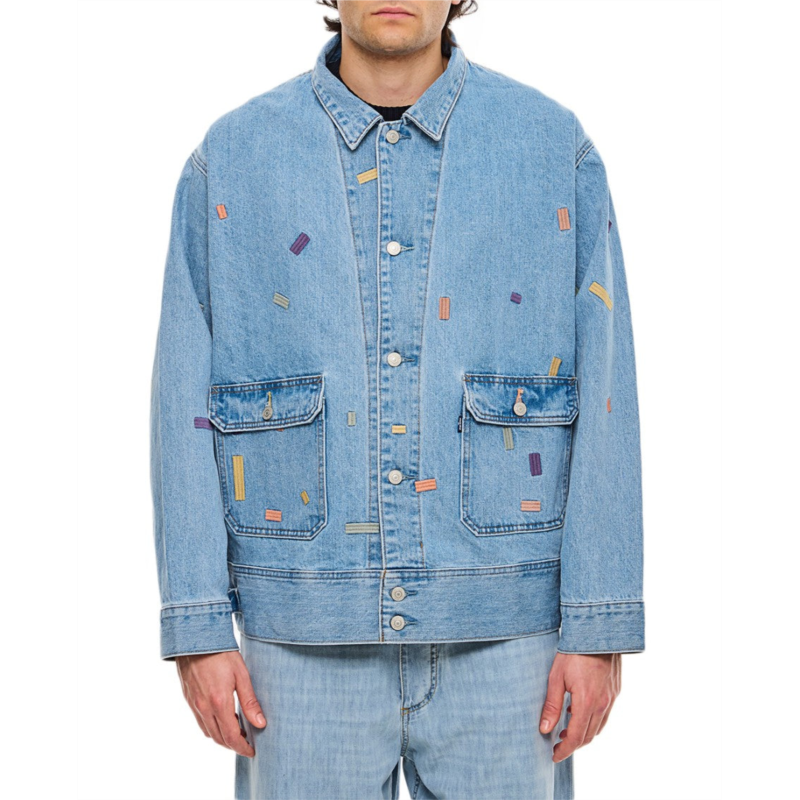 This denim jacket by Levis combines practicality with style. It has a button closure and two frontal pockets, making it functional for everyday wear. The cuffs are designed with buttons for a comfortable fit, and colorful embellishments enhance its classic appeal.