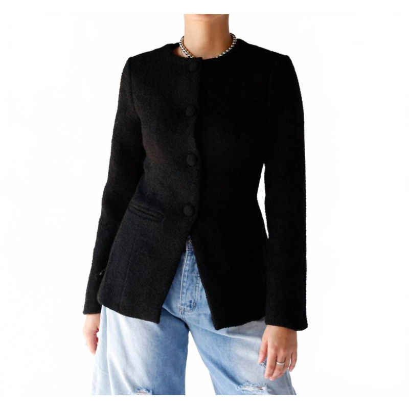 A casual yet cool jacket that every closset needs.Introducing the Margot Boucle Blazer by MABLE, a chic and versatile piece in timeless black. This blazer boasts long sleeves and a textured boucle composition for a sophisticated, tactile appeal. It features a tailored silhouette with a crewneck and a clean button closure for a refined finish. Ideal for the fall season, it effortlessly transitions from day to night, making it a perfect choice for both workwear and special occasions like New Years Eve.