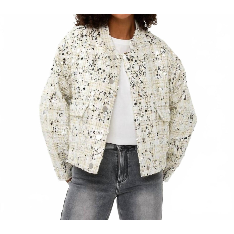 A riff on your favorite classic bomber jacket.Festive bomber jacket with snap buttons in a tweed fabric interwoven with glittering lurex and decorated with sequins in various sizes.