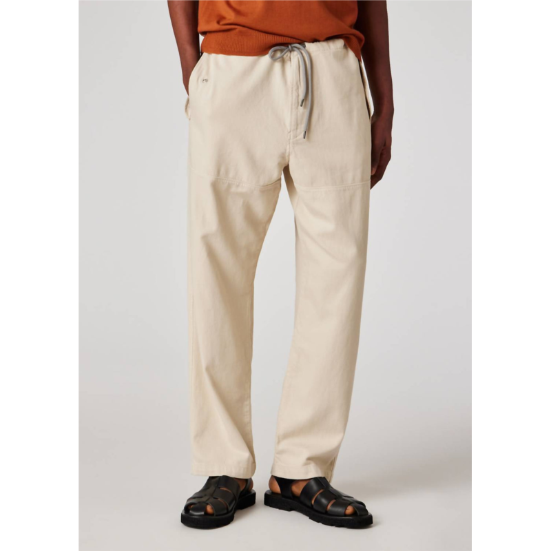 Introducing the Relaxed-fit Ecru Cotton-linen Trousers by Paul Smith, perfect for streetwear enthusiasts who value comfort and style. Crafted from an 85% cotton and 15% linen blend, these lightweight trousers feature a relaxed fit with a straight leg design. The pull-on closure includes a practical drawstring waist and front press-stud pockets, making them ideal for travel. Care instructions recommend machine washing to maintain the quality of these mid-rise cargos.