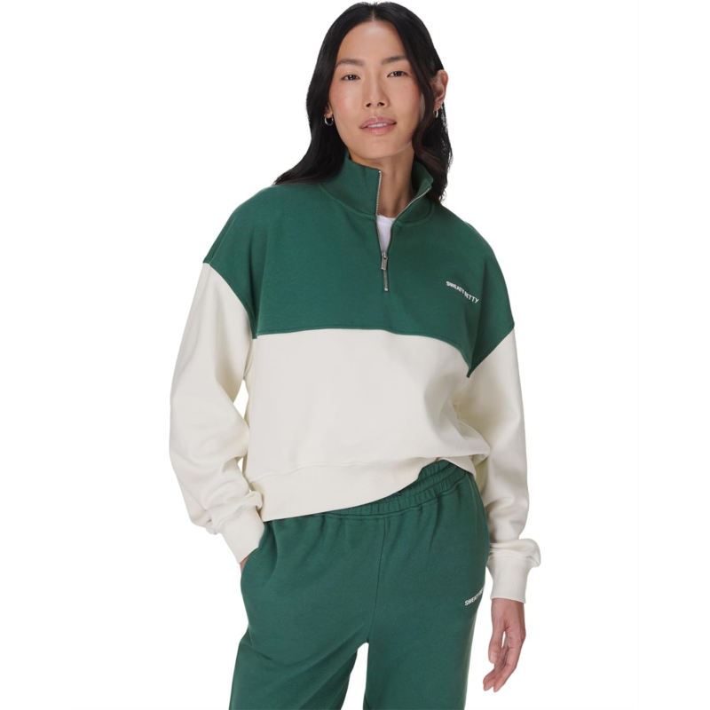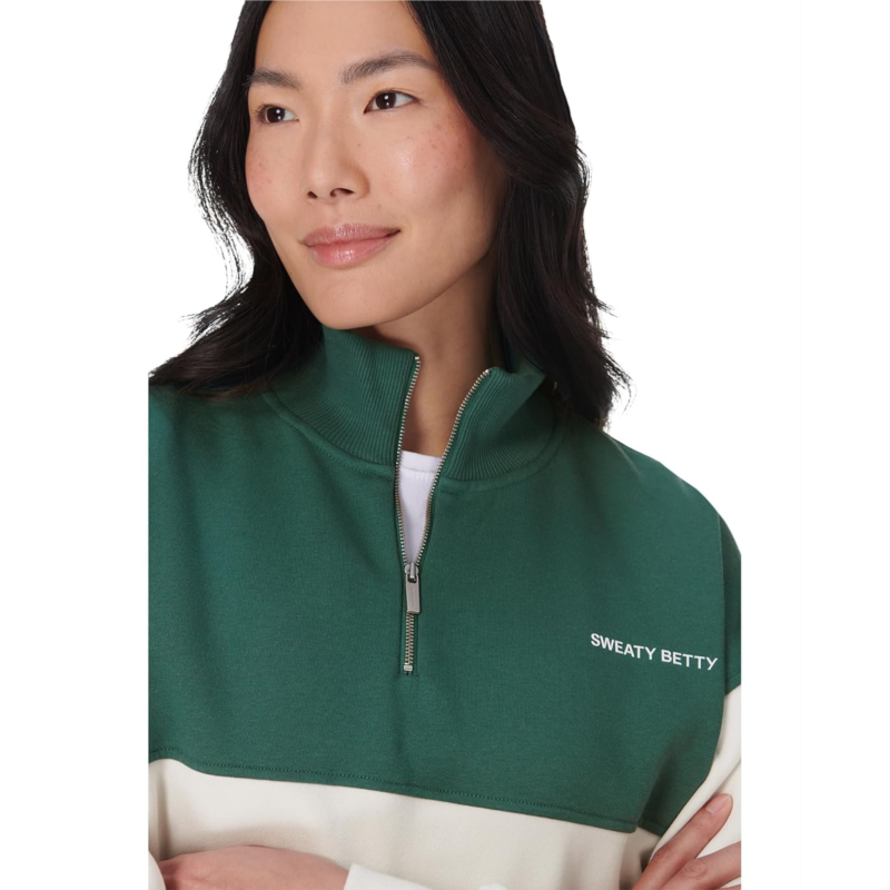 Head out for a casual run or train comfortably wearing the Sweaty Betty Revive Crop 1/2 Zip Pullover. A fresh take on our elevated half-zip sweatshirt, the pullover for women is made from a soft and breathable cotton blend. It features a mock neck, half-zip closure, dropped shoulder design that falls to the top hip, long sleeves, and ribbed details at the cuffs, neck, and waistline. The brand logo detail at the left chest adds an authentic touch.