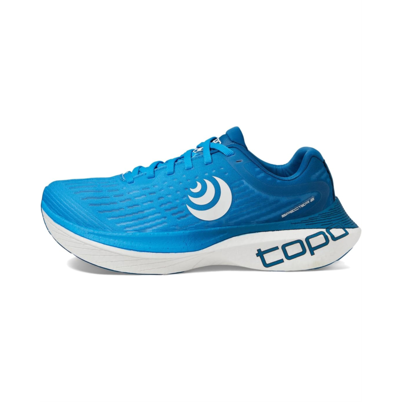 The Topo Athletic Specter 2 shoes are high-performance, max-cushioned trainers designed for up-tempo, long-distance running. These sneakers are crafted with a recycled mesh upper that offers a secure, lightweight fit with optimal breathability. The OrthoLite footbed of these sports shoes provides a soft step-in feel while the polyester lining keeps your feet cool and comfortable. Designed with a lightweight, full Pebax Powered midsole that ensures a fast and responsive ride, these sneakers are comfortable to wear all day. The platform of these lace-up shoes features an additional 2 mm of cushioning for even more comfort.