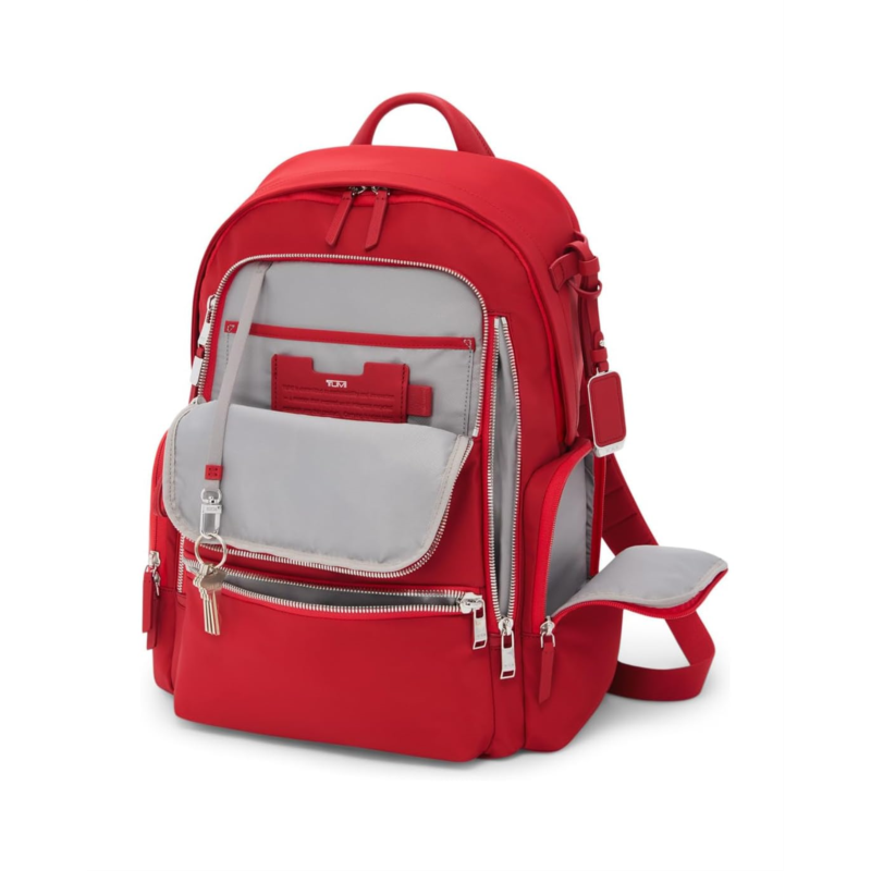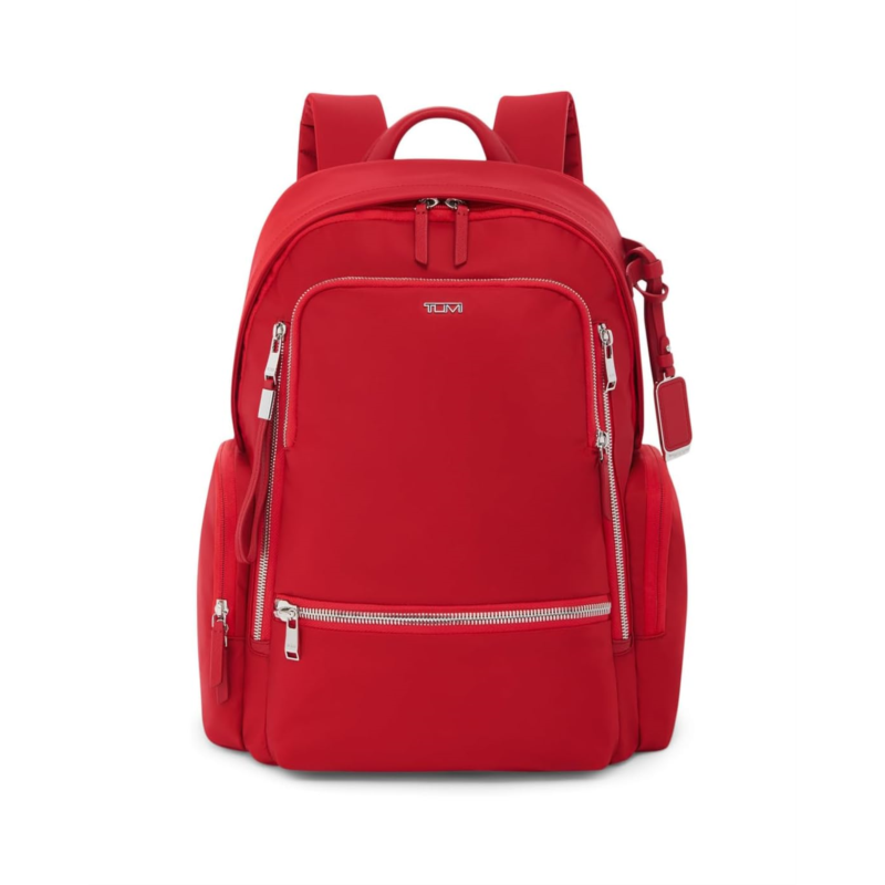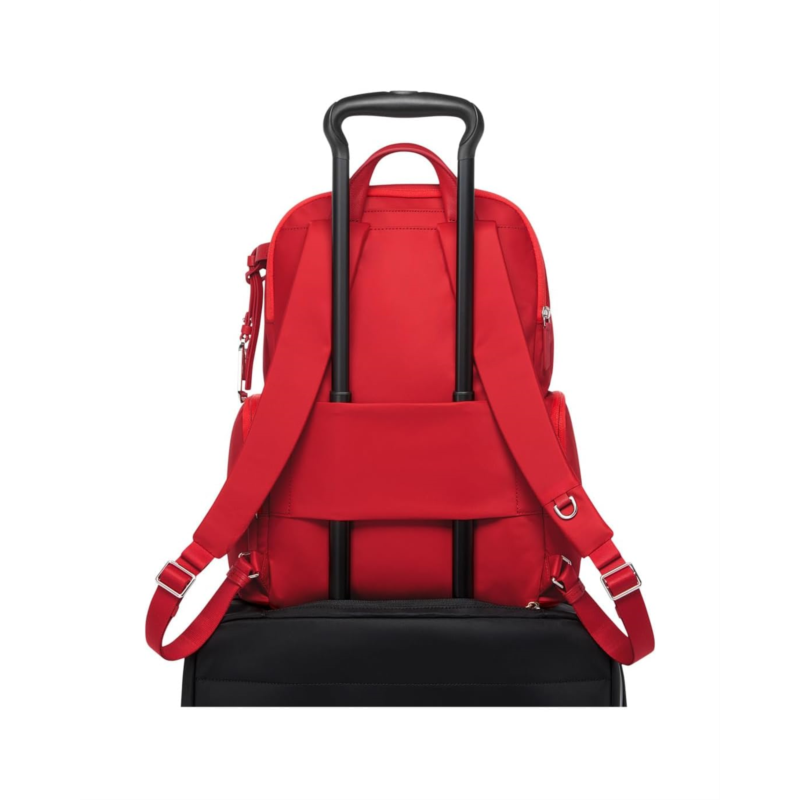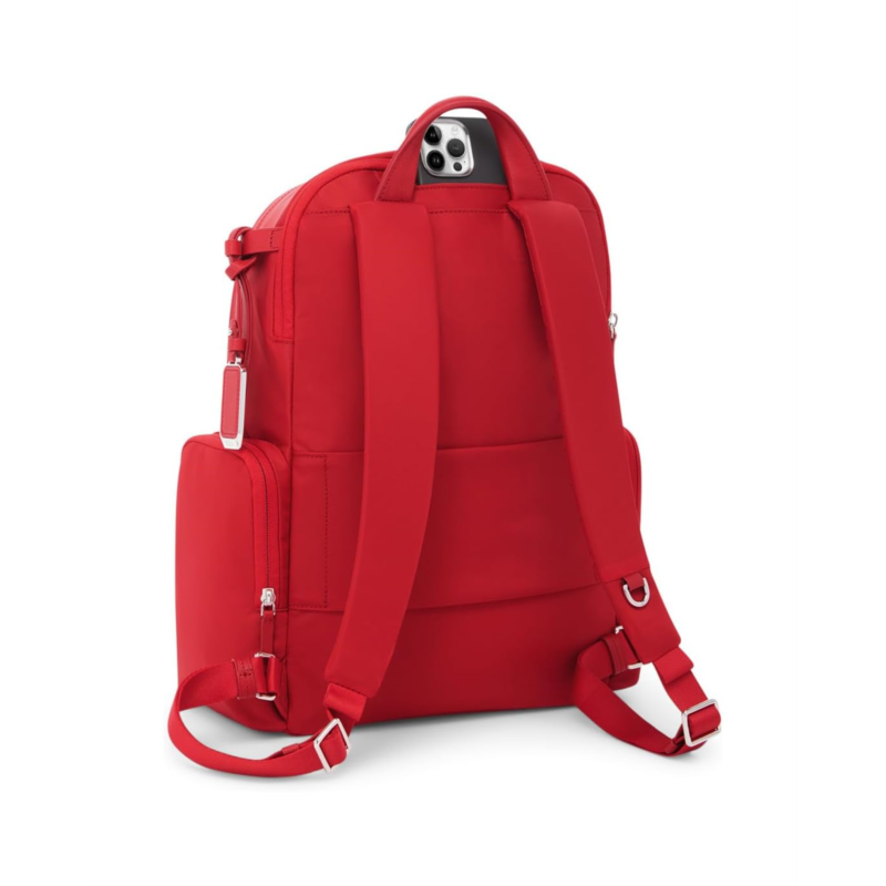 - Travel light and follow your dreams carrying the Tumi Celina Backpack. Crafted from nylon, this bag features double-zippered entry to main compartment, zippered laptop compartment, leather top handle, U-zippered exterior pocket, two zippered front pockets, zippered front entry to main compartment, zippered side pocket and double-zippered side water-resistant water bottle pocket. It has padded adjustable backpack straps with d-ring & loop compatible with brand accessories, quick-access phone pocket and detachable monogram leather charm. This bag also has zippered interior pocket, tumi tracer, two interior media pockets and leather card pocket.