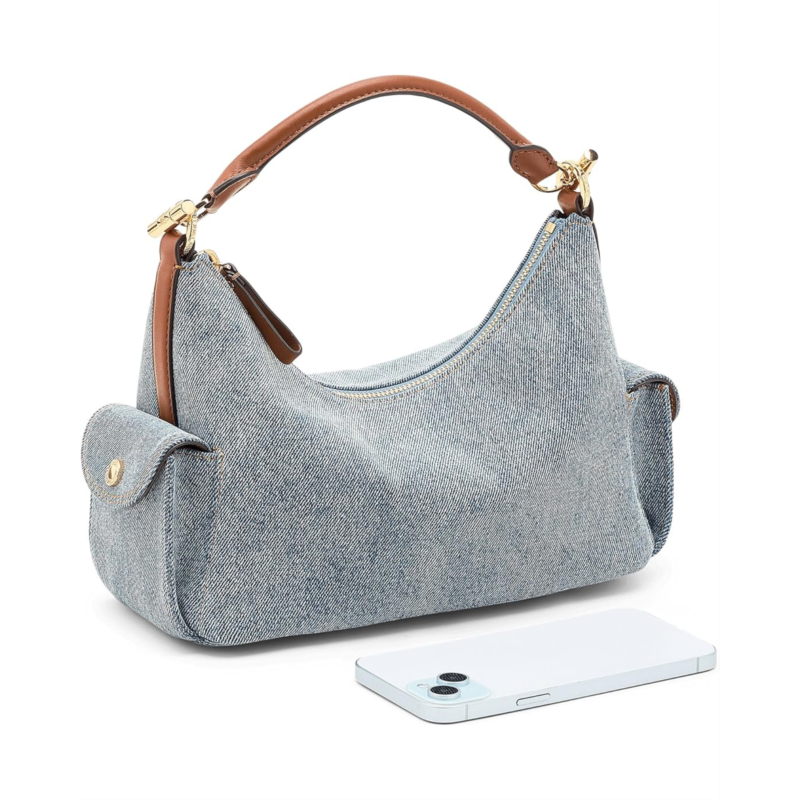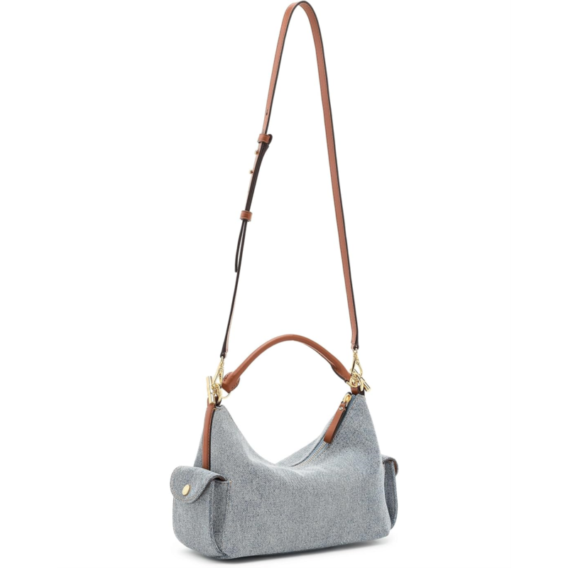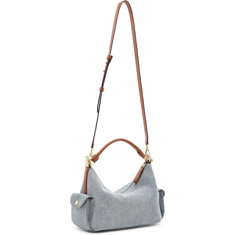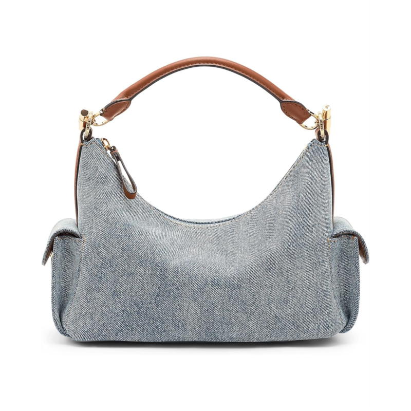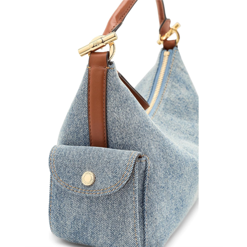 - Crafted with a combination of washed denim and supple full-grain leather trim, the Lauren Ralph Lauren Washed Denim Small Blaike Shoulder Bag features a slouchy, east-west silhouette and two convenient exterior snapped cargo pockets. A removable, adjustable crossbody strap offers hands-free styling, while LRL-engraved toggle hardware at the top handle adds signature style. This shoulder purse is designed with brass-finished magnetic snaps custom-developed with a Lauren Ralph Lauren logo, a zippered top closure, and a brass-finished plaque custom-developed with a Lauren Ralph Lauren est. 1967 logo at the interior. Made from cotton, it has an interior zippered pocket for added storage.