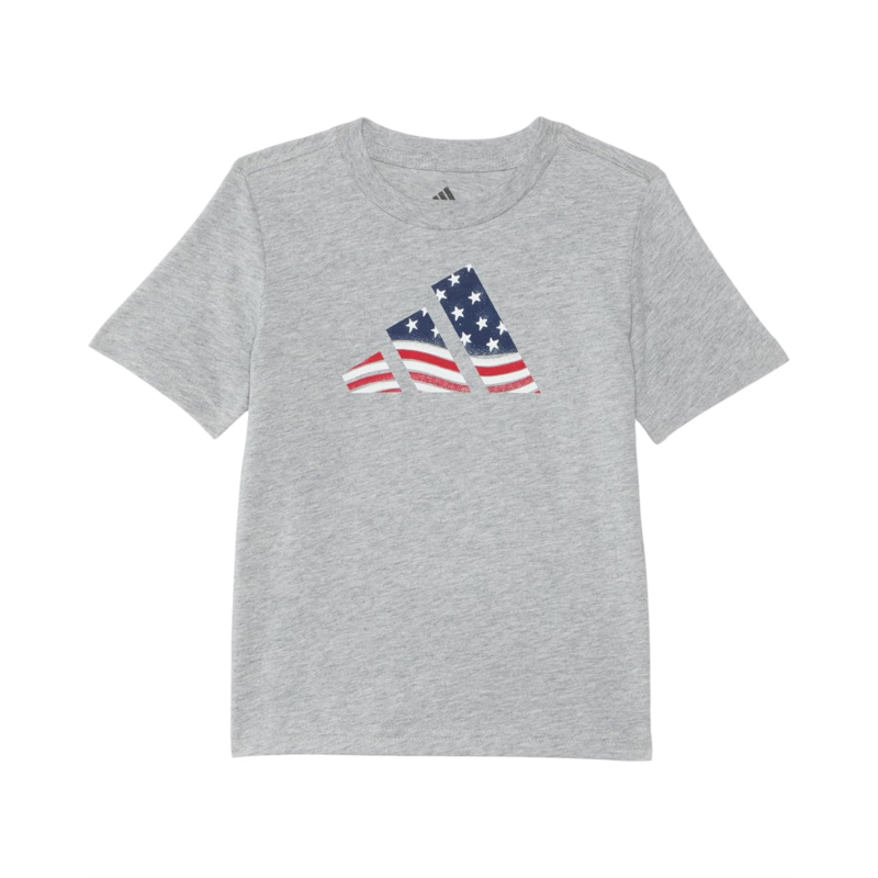 Stars, stripes & sporty vibes in the adidas Kids USA Flag Logo Tee. Designed with a regular fit, classic crew neck, and short sleeves, this tee is as effortless as it is iconic. The bold adidas logo on the front gets a patriotic twist, making a statement wherever he goes. Crafted from silky soft fabric, it delivers next-level comfort for school, play, and everything in between. Easy pull-on style makes dressing a breeze, so he can focus on repping his American pride in style!