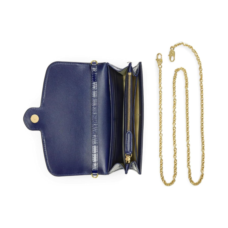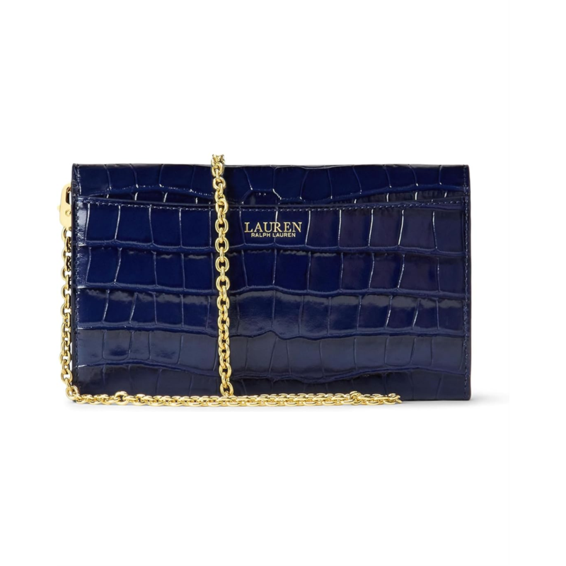 Crafted with metallic crocodile-embossed leather and finished with a modern chain strap, the Lauren Ralph Lauren Croc-embossed Medium Adair Crossbody combines the convenience of a crossbody bag with the essential storage of a wallet thanks to its compact silhouette and array of pockets. An oval-shaped LRL logo at the front provides a signature finish. This crossbody purse is designed with a magnetic snap closure and removable brass-finished chain crossbody strap.