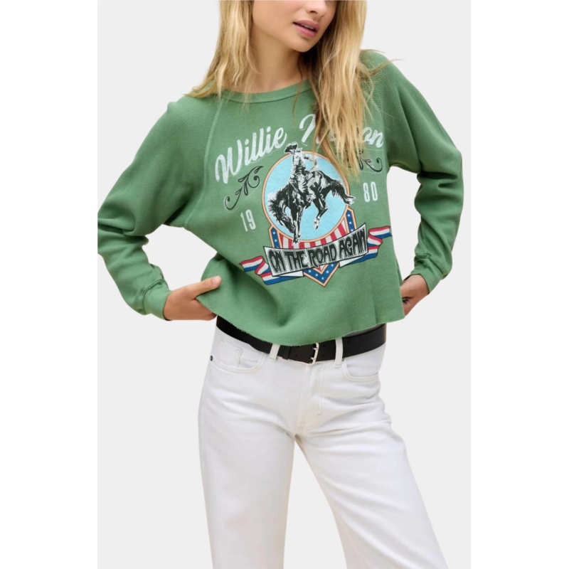 Whether youre running around town or lounging at home, this sweatshirt works for both.Embrace your adventurous spirit with the Rayna Willie Nelson Crop Crew Neck by Daydreamer, crafted for an effortlessly stylish journey. This long sleeve sweatshirt in stone green features a cropped length and a solid waffle texture for a unique look. Neckline - Crewneck. Closure - Pull on. Perfect for fall travels and inspired by the iconic Willie Nelson, its a must-have for your Western-inspired wardrobe.