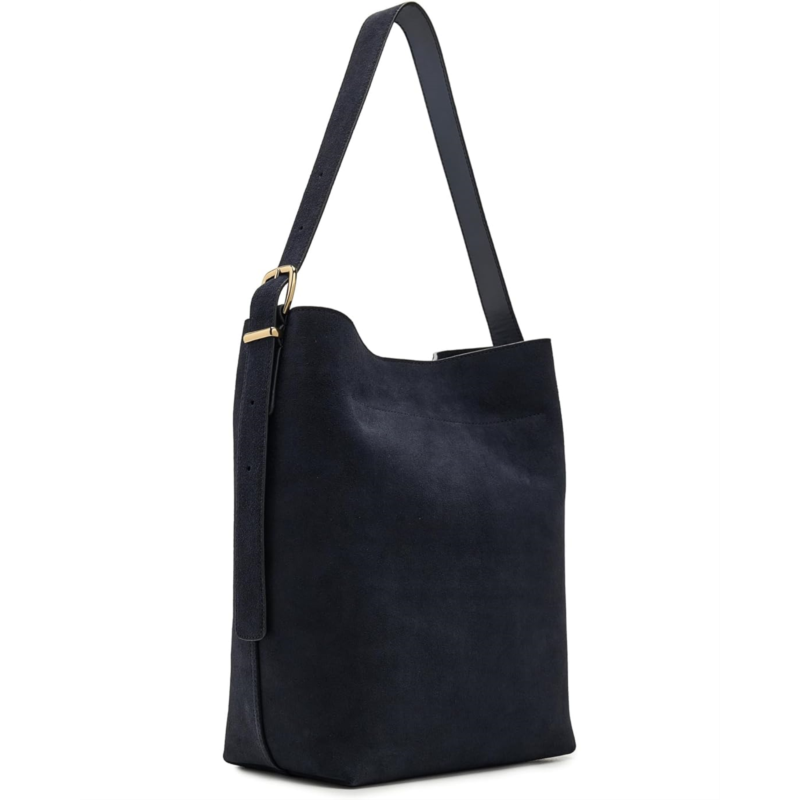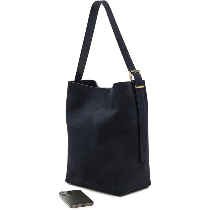 - This bestselling leather bag collection is cool, modern and quietly luxe. With a magnetic closure and interior pocket, this suede bucket tote is perfectly sized to hold up to a 15 laptop, water bottle, phone, wallet and keys-plus it has an adjustable shoulder strap. Its so good, its Essential.