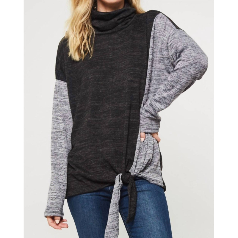 A perfect addition to any wardrobe, this classic tunic style blouse is flattering and effortless. You can easily transition from desk to dinner in this chic top.This super soft & cozy knit top is simply chic!? It features a two tone knit color block design in charcoal & black, a mock neckline, dropped shoulders, long sleeves and a knotted hem detail.