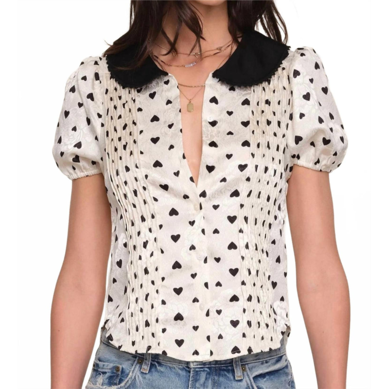 Pair this with your favorite jeans and slides for your next girls night out.Introducing the Mindi Blouse by Heartloom, a holiday party essential with a charming heart print. This short sleeve top is crafted from 100% polyester crepe de chine and boasts delicate pintucks with a lace collar, embodying feminine elegance. It features a button down closure for a sleek finish. Falling to a length of 22.5 inches from the shoulder, this piece is perfect for spring occasions.