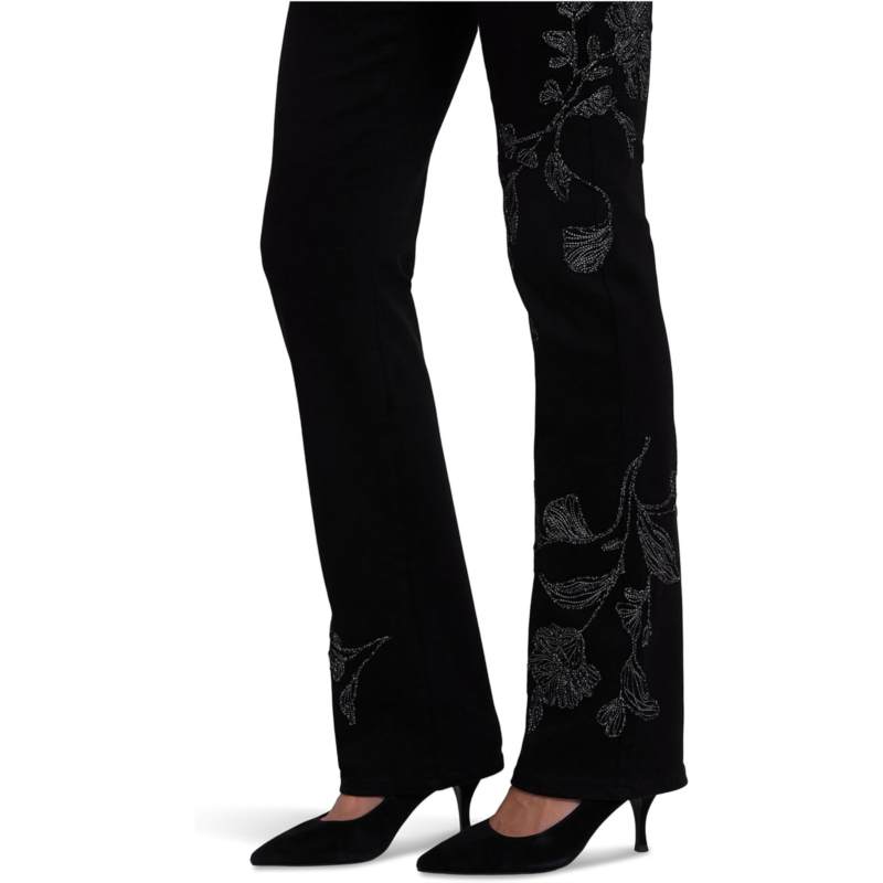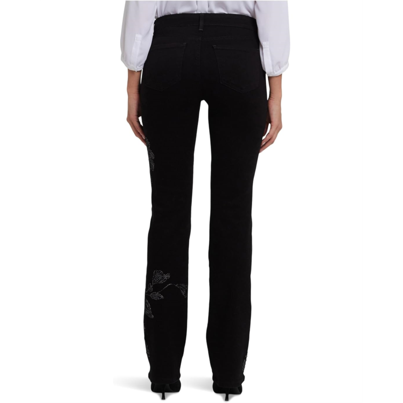 - Show off a subtle and stylish look wherever you go wearing the NYDJ Marilyn Straight Embroidery Jeans in Black Rinse. The curve-sculpting, figure-elongating construction of this jeans pairs well with everything, in a classic straight-leg silhouette. Lift Tuck Technology lifts and shapes curves so you instantly appear one size smaller. This Marilyn Straight style jeans features a mid-rise waist with belt loops, a zip-fly with button closure, a five-pocket design, and front embroidery that gives it a unique boho-chic look.