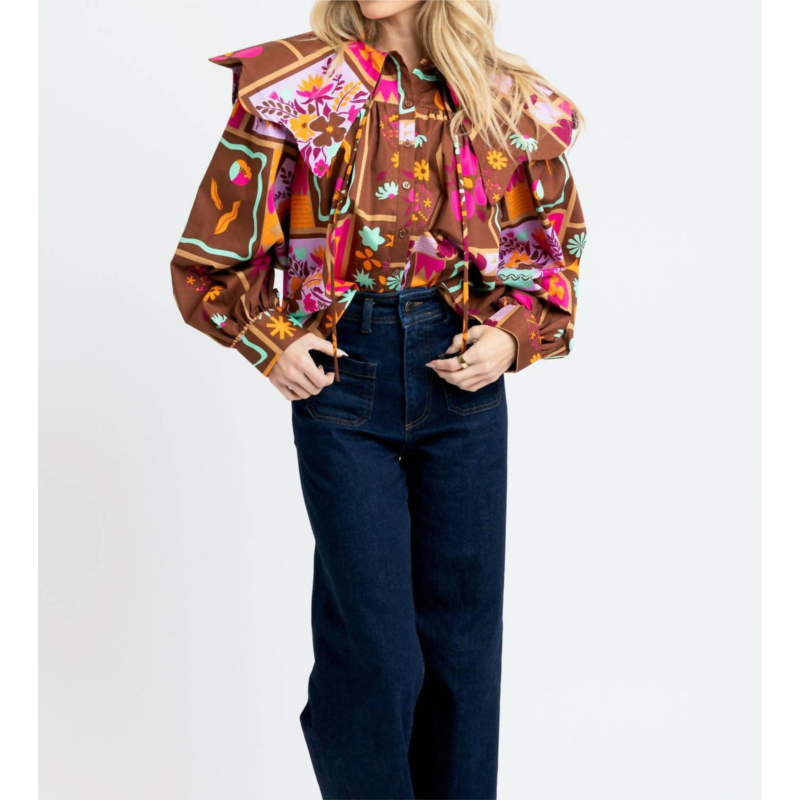 Pair this with your favorite jeans and slides for your next girls night out.Meet the Abstract Peter Pan Collar Top by Karlie, a must-have for your spring collection. This womens blouse showcases long sleeves and a playful patterned design in brown, perfect for a holiday party or any joyful occasion. The standout feature is its enchanting Peter Pan collar, seamlessly complemented by a button-down closure for effortless wear. Embrace the vintage-inspired elegance of this charming piece and make it a staple in your wardrobe.