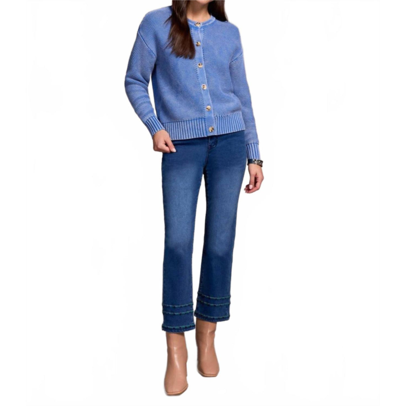A classic fit that works just as good buttoned as it does left open.Introducing the Button Front Cardigan by TRIBAL, a sophisticated addition to your fall wardrobe in an eye-catching Ultra Blue. This long-sleeve cardigan is crafted from breathable cotton yarn, ensuring both comfort and style with its textured pattern and classic button closure. The piece is elevated with luxurious tortoise button details and a vintage finish. Care instructions - machine wash for effortless maintenance.