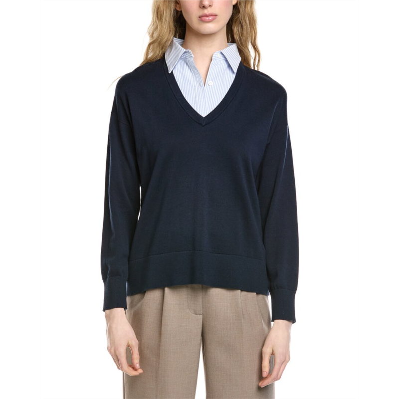 - Removable Striped Collar Sweater In Navy With V-Neck, Ribbed Trim And Removable Collar And Bib