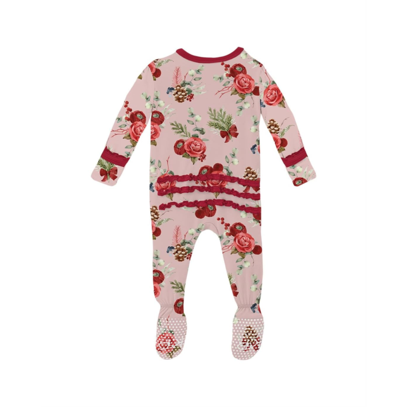 - The Kickee Pants Kids Print Muffin Ruffle Footie with 2 Way Zipper is designed to wrap your little one in buttery-soft goodness. Cozy with adorable ruffles, this kid''s bodysuit has flip paws to cover chilly hands and prevent scratching, fleece on the inside feet, and no-slip grips on the outside feet. It is made from super soft, breathable, and tag-free signature blend fabric that is perfect for sensitive skin. The zippered front closure makes for easy changes, and it''s topped with a zipper guard so it won''t accidentally pinch the skin. This printed bodysuit is designed to be a snug fit so that it is safe to sleep in and meets all CPSC safety standards. It comes with long sleeves and a crew neckline. Comfortable and stylish, this footie is a smart garment choice for keeping babies and kids warm while allowing for movement.