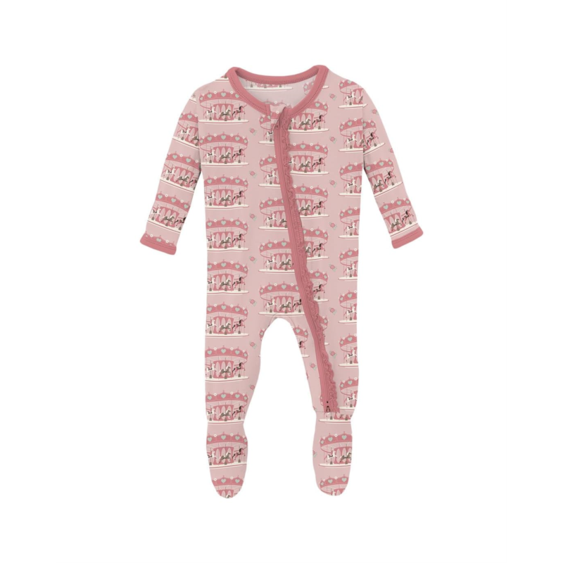 - The Kickee Pants Kids Print Muffin Ruffle Footie with 2 Way Zipper is designed to wrap your little one in buttery-soft goodness. Cozy with adorable ruffles, this kid''s bodysuit has flip paws to cover chilly hands and prevent scratching, fleece on the inside feet, and no-slip grips on the outside feet. It is made from super soft, breathable, and tag-free signature blend fabric that is perfect for sensitive skin. The zippered front closure makes for easy changes, and it''s topped with a zipper guard so it won''t accidentally pinch the skin. This printed bodysuit is designed to be a snug fit so that it is safe to sleep in and meets all CPSC safety standards. It comes with long sleeves and a crew neckline. Comfortable and stylish, this footie is a smart garment choice for keeping babies and kids warm while allowing for movement.