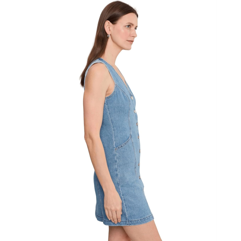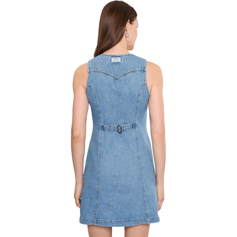 - Sleek with a little bit of structure, the Levis Womens Vianna Vest Dress is an easy grab-and-throw-on. Cut with a form-flattering fit, this sleeveless dress is made from cotton for all-day comfort. It is designed with a V-neckline, a classic button-up front, a straight hem, and an easy above-the-knee length. The buckle closure at the back offers a snug fit. This denim dress works for different occasions.