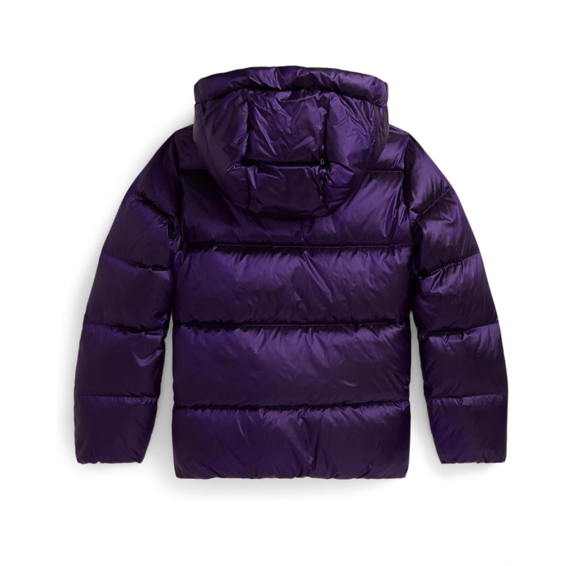 - The Polo Ralph Lauren Kids Metallic Down Hooded Jacket features a water-repellent shell, 650-fill-power down, and a snap-off hood for added protection on chilly, rainy days. A metallic hue makes it extra cute. Made from polyester, this puffer jacket has a zippered front closure with a snap-button storm placket, which is custom-developed with a PRL logo. Its signature embroidered Pony at the left chest adds to its style. This hooded jacket is styled with long sleeves, elasticized cuffs, a mock neckline, and an elasticized hem. Designed with a signature name tag label at the interior, this zip-up jacket is fully lined and filled for long-lasting comfort and warmth.