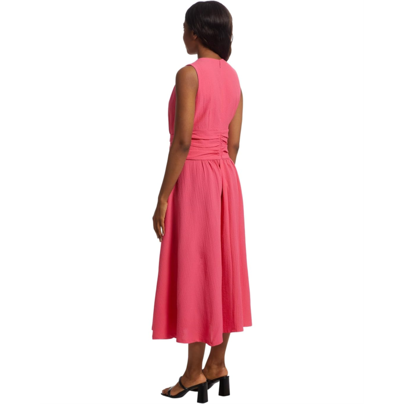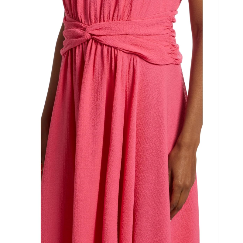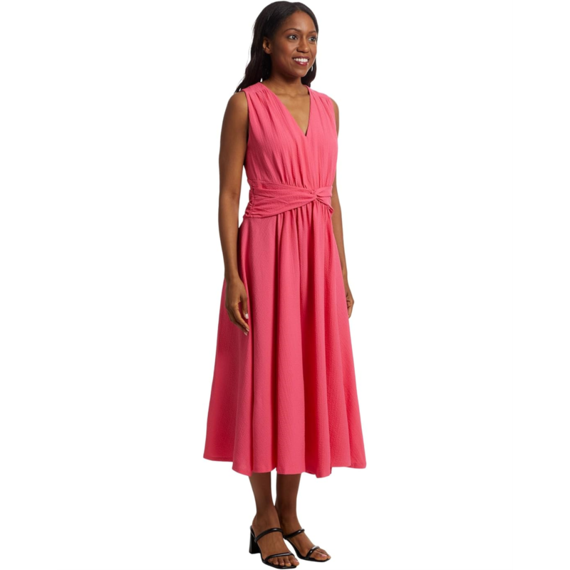 - From brunch to ballrooms, look graceful, and elegant wearing the Calvin Klein Gauze Twist Front Aline. This dress features V-neckline, sleeveless style, zippered back closure, twist detailing on the front waist, and midi-length silhouette.