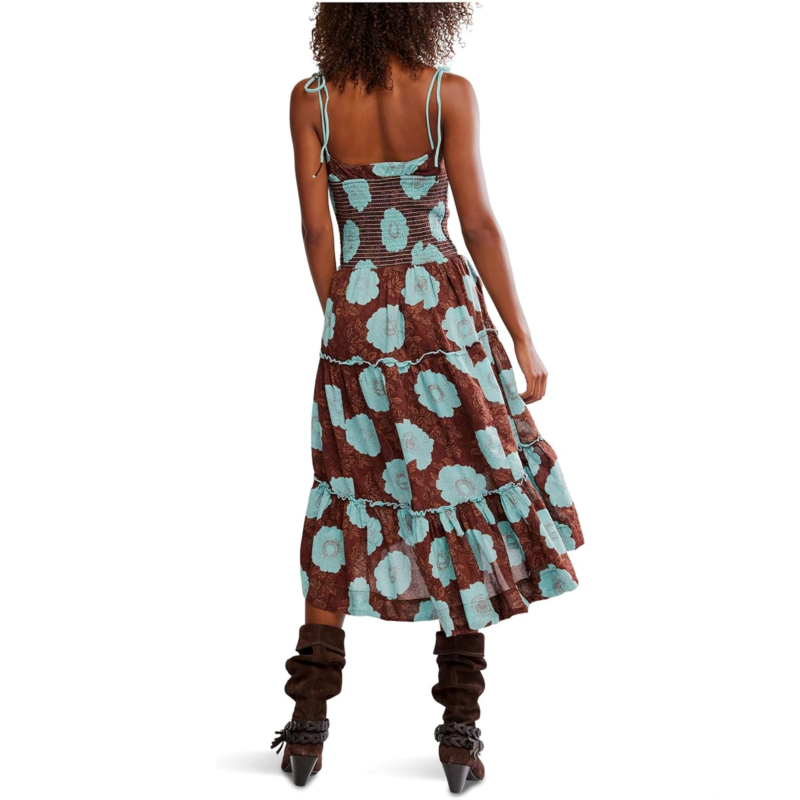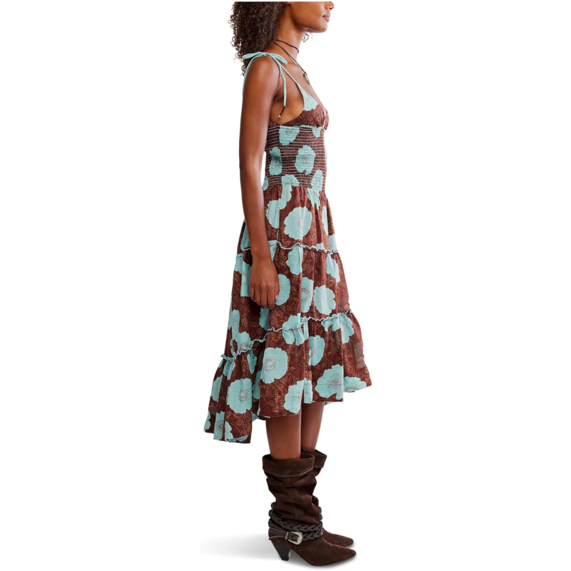 - Breezy and romantic, the Adriel Midi Dress by Free People captures the essence of effortless femininity. Featuring a flattering scoop neckline, adjustable tie straps, and a smocked bodice for a comfortable fit, this tiered silhouette dress flows gracefully with every step. The ideal piece to take you from your daytime event to a night out on vacation, this versatile floral-printed dress is sure to be your go-to pick for a head-turning look.