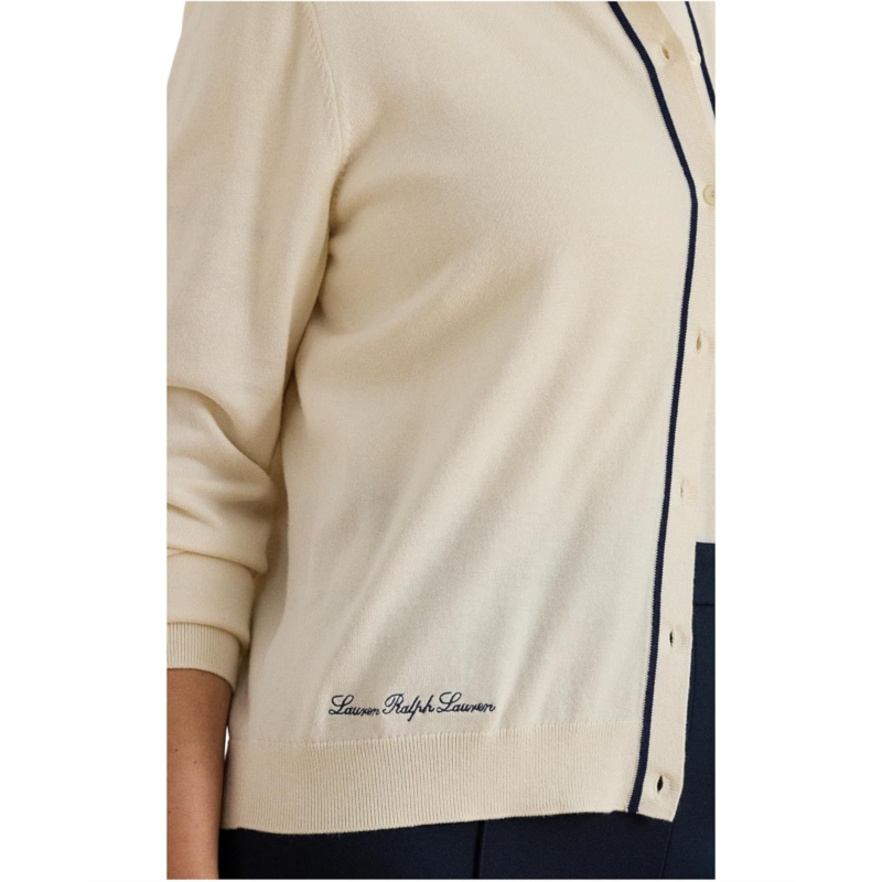 - Knitted with a soft blend of cotton and Modal, the Lauren Ralph Lauren Plus Size Two-Tone Cotton-Modal Cardigan features a two-tone design embroidered with Laurens script logo at the hem. This refined sweater features a buttoned front placket with buttons custom-developed with a Lauren Ralph Lauren logo. It is designed with long sleeves, ribbed cuffs, a ribbed crew neckline, and a straight hem.