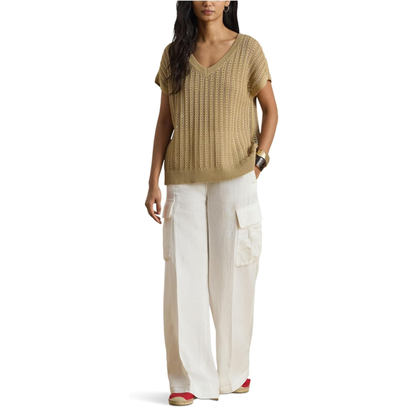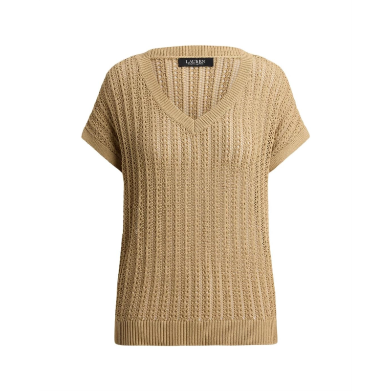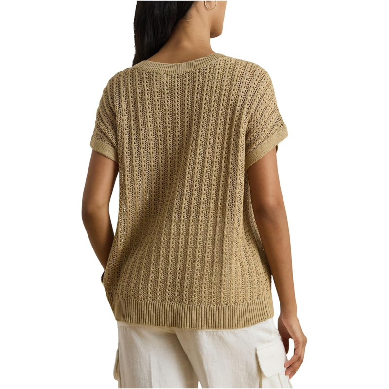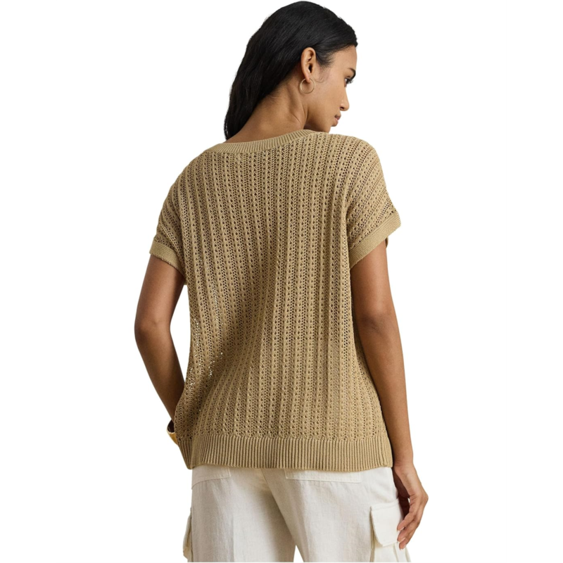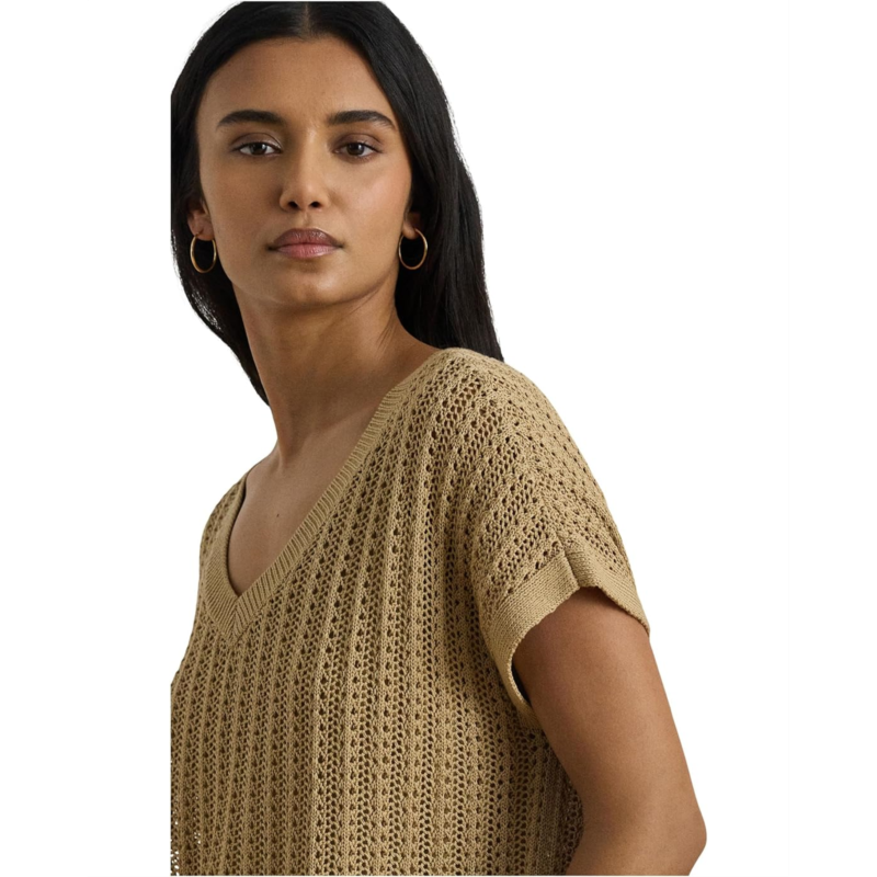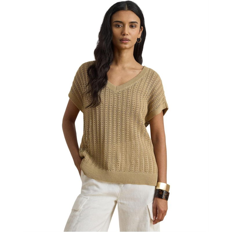 - Perfect for warm-weather dressing, this lightweight Lauren Ralph Lauren Petite Cotton-blend Mesh Short Sleeve Sweater features short sleeves, a V-neck, and an open-knit mesh construction. Designed in a relaxed fit for effortless comfort, it is finished with ribbed detailing at the neckline and hemline for a polished touch. The pullover construction ensures easy wear, making it a breezy and versatile addition to your everyday wardrobe.
