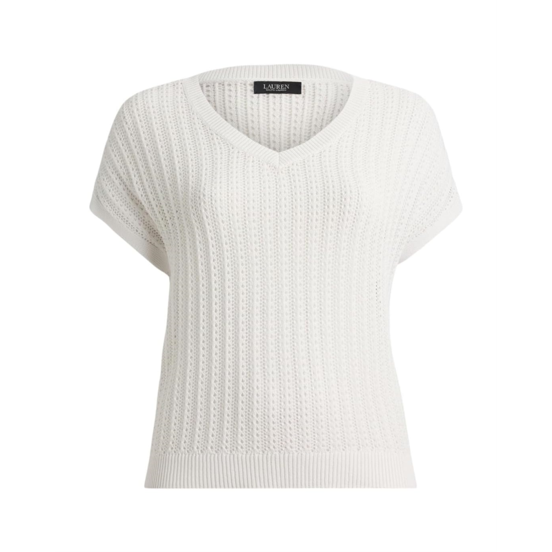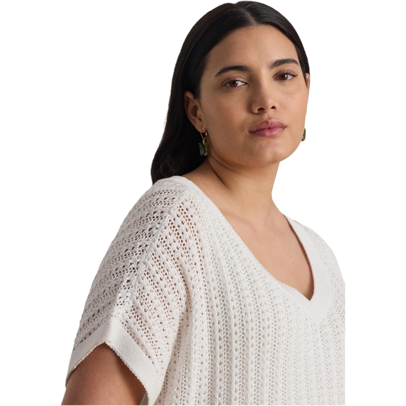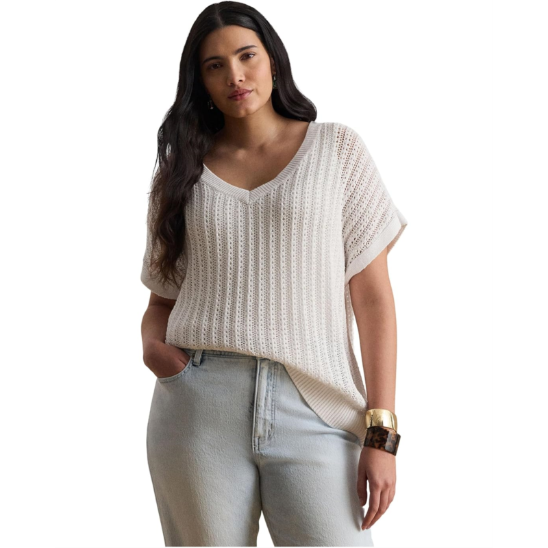 - Perfect for warm-weather dressing, this lightweight Lauren Ralph Lauren Plus Size Cotton-blend Mesh Short Sleeve Sweater features short sleeves, a V-neck, and an open-knit mesh construction. Designed in a relaxed fit for effortless comfort, it is finished with ribbed detailing at the neckline and hemline for a polished touch. The pullover construction ensures easy wear, making it a breezy and versatile addition to your everyday wardrobe.