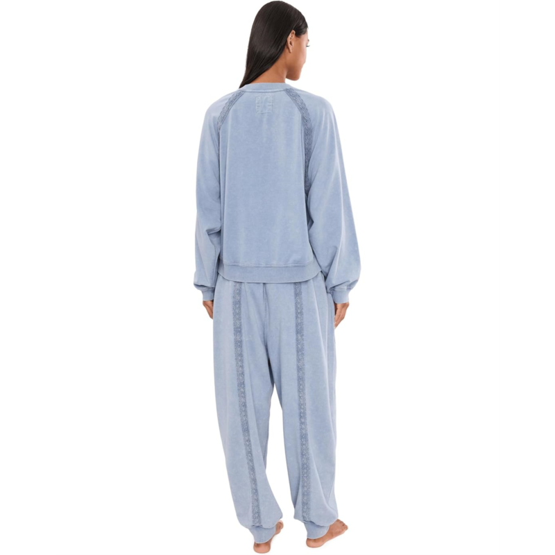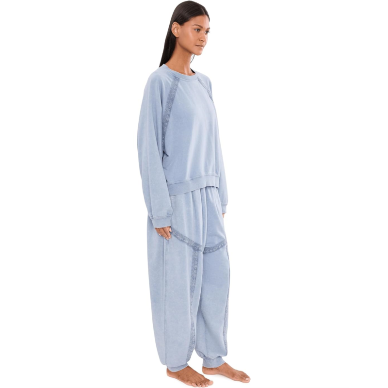 - The Free People Couch Club Pj Set is a cozy two-piece loungewear ensemble made from a soft terry cotton blend. The pullover sweatshirt is designed with a crew neckline and relaxed balloon sleeves, giving it a laid-back yet stylish silhouette. The pull-on pants feature an elasticized drawcord waistband for an adjustable fit, two on-seam side pockets, and ribbed cuffs that add a snug finish.