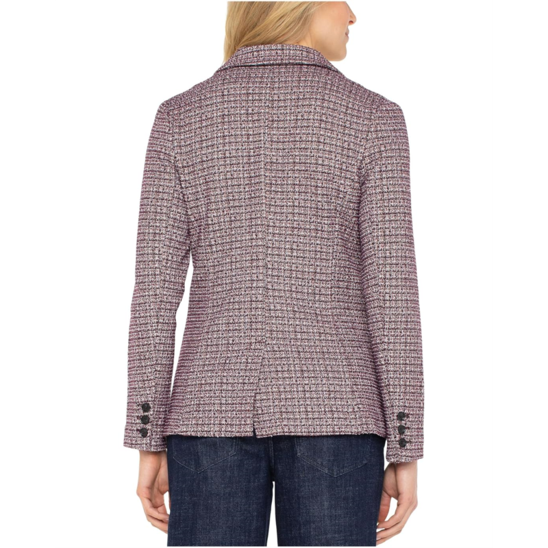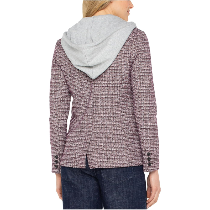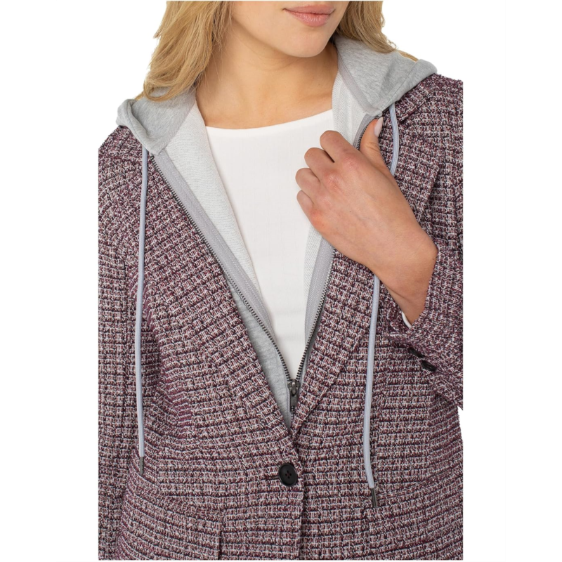 - Introducing the Liverpool Los Angeles Boyfriend Blazer W/ Removable Hood, a perfect blend of style and functionality. The hood, complete with drawstrings, provides versatility during transitional weather, while the button closure adds a touch of sophistication. The beautiful knit plaid jacket has a notched lapel collar, long sleeves, and a back vent.