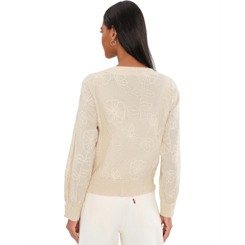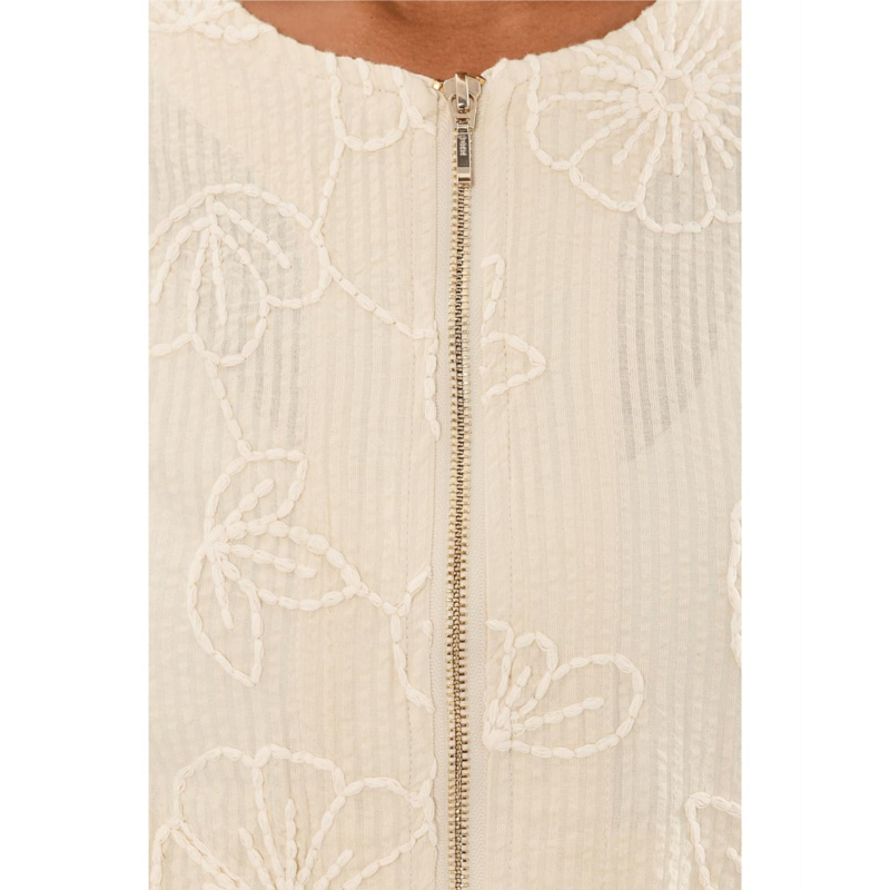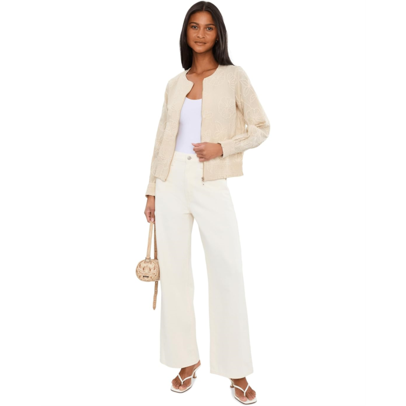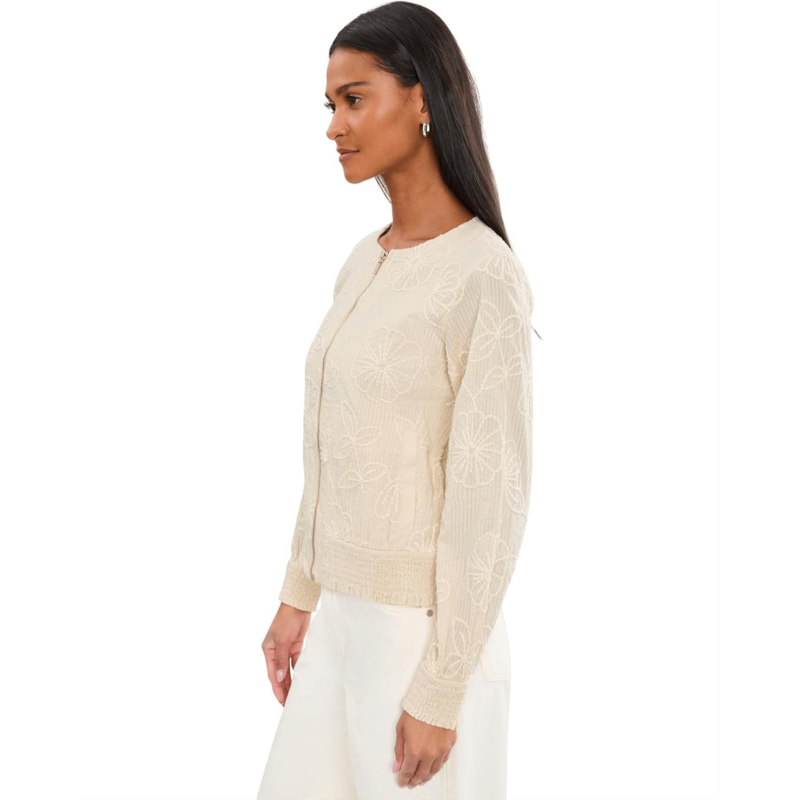 - The Liverpool Los Angeles Petite Long Sleeve Collarless Jacket with Smocking is the epitome of chic sophistication. This jacket is designed to be a standout piece in your wardrobe with its intricate allover floral embroidery, effortlessly combining classic tailoring with modern details. It features a crew neck, full zipper-front closure, two front welt pockets, long sleeves with smocked cuffs, and a smocked hem. Whether youre dressing up or adding a bit of flair to your casual ensemble, this jacket is incredibly versatile.