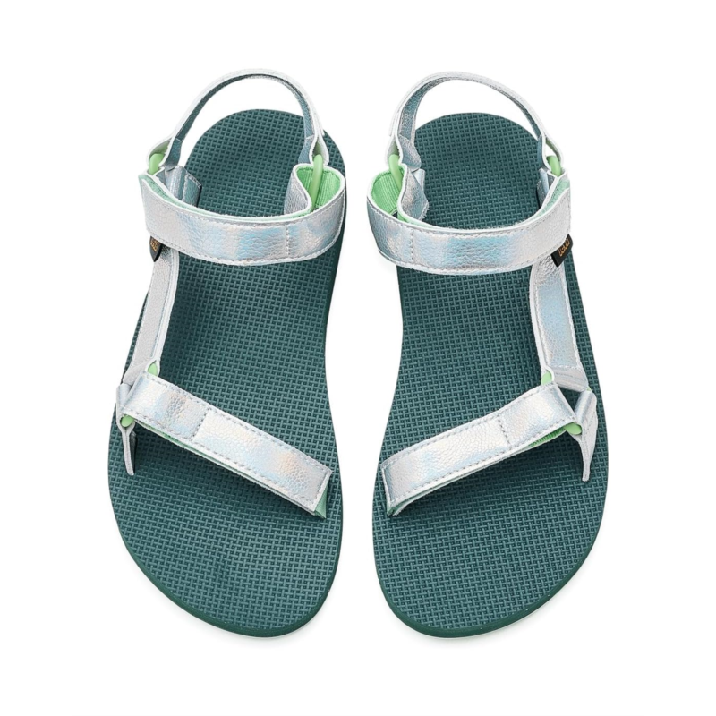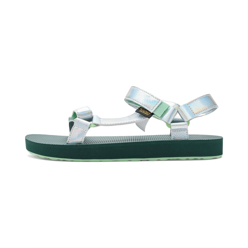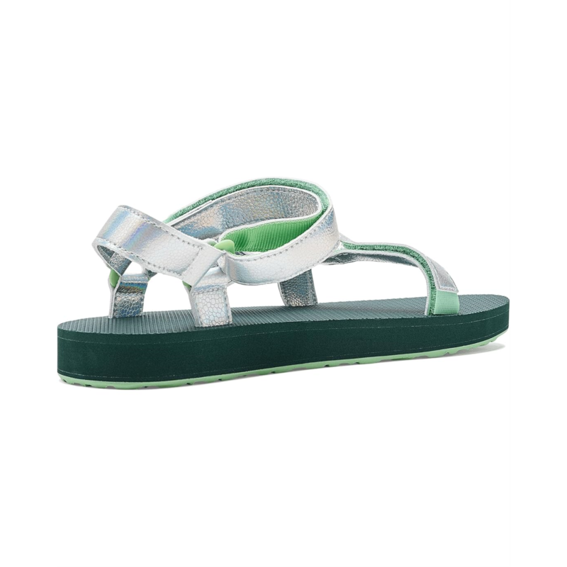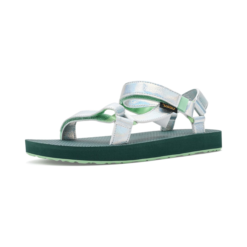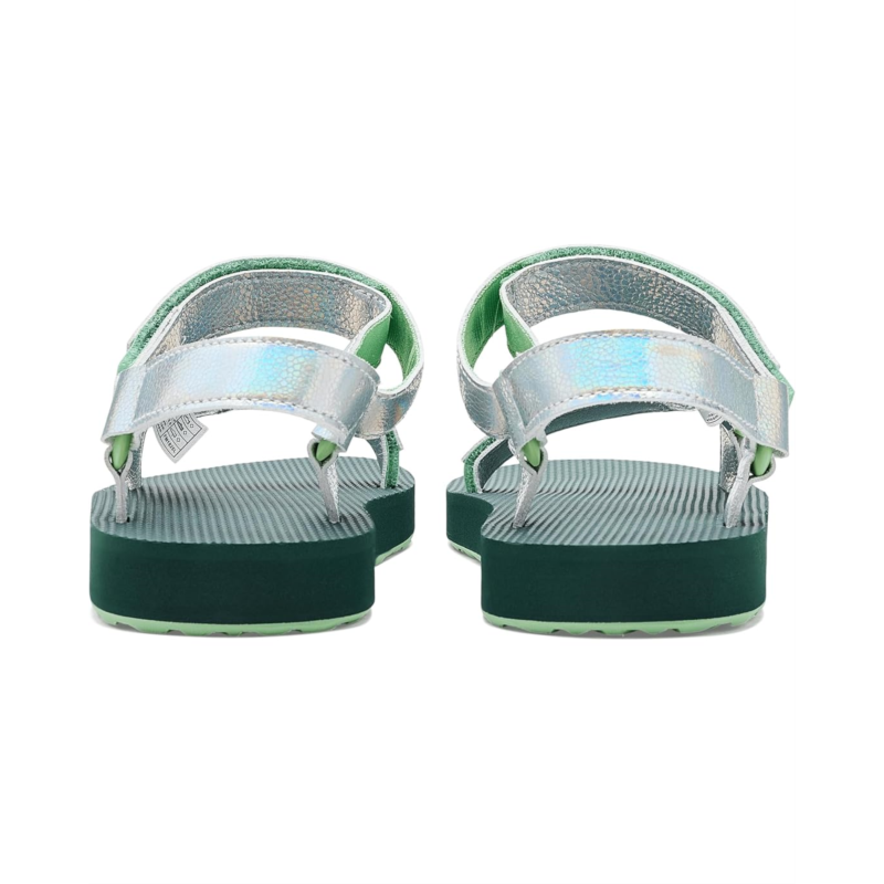 - Putting a shimmering spin on the Original Universal, this shiny Teva kids Shine sandal lends the same wet-to-dry versatility as our adult version. Cuing up a cushy footbed, weve enlisted a wear-all-day sole thatll take your kiddos from sand to sidewalk and every scoop shop in between. Designed with mermaid-inspired shiny straps, these sandals feature three adjustable points for a customized fit. A molded, recycled ethylene-vinyl acetate midsole provides heel and arch support, while the durable recycled rubber outsole ensures dependable traction for active days.