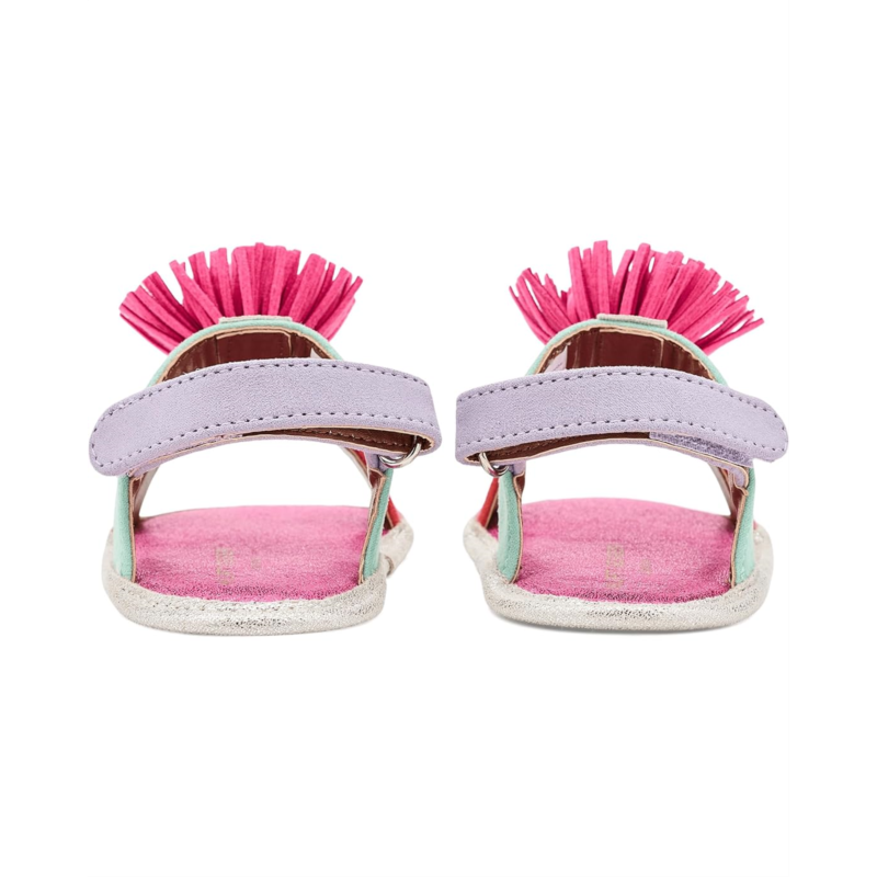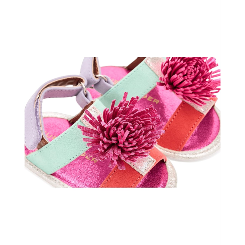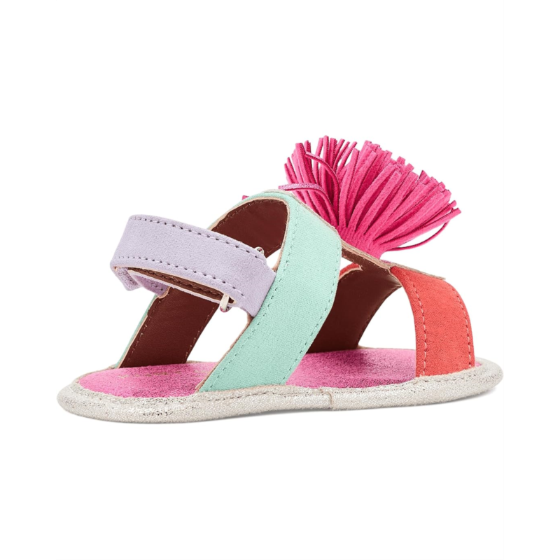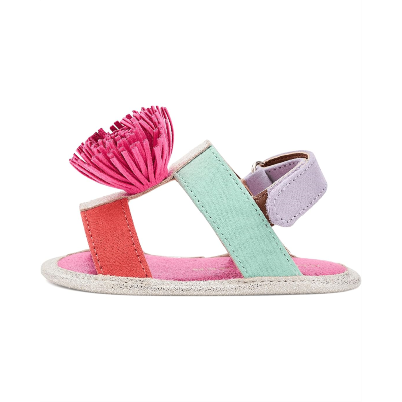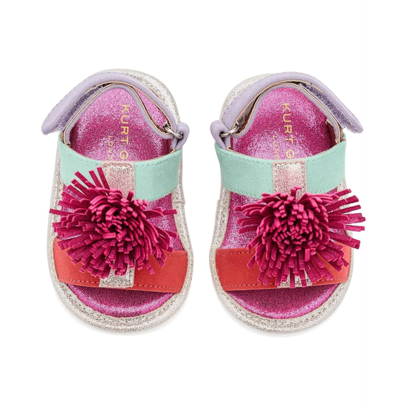 - The Kurt Geiger London Kids Baby Orson sandals are designed with a voluminous fringe pom pom that brings adorable charm to your kids look. These slip-on sandals feature an adjustable slingback strap with a hook-and-loop closure for easy wear. They are made of a leather upper, a cushioned insole, and a synthetic lining.