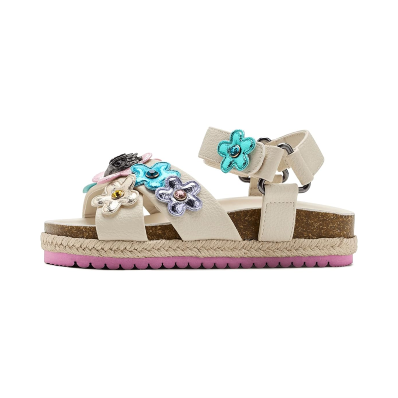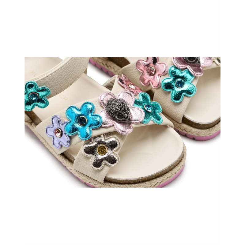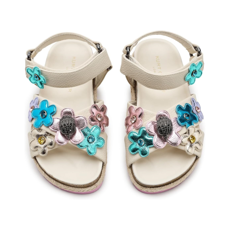 - Bloom into sunny-day fun with the Kurt Geiger London Kids Mini Kensington Flower sandal! This adorable style features soft leather and charming flower details that add a playful, feminine touch to the trendy chunky sole. The easy hook-and-loop closure makes slipping them on and off a breeze, while the durable construction and non-marking sole keep up with all their playground adventures, park strolls, and playdates. Perfect for little trendsetters who love comfort, style, and a sprinkle of floral whimsy!