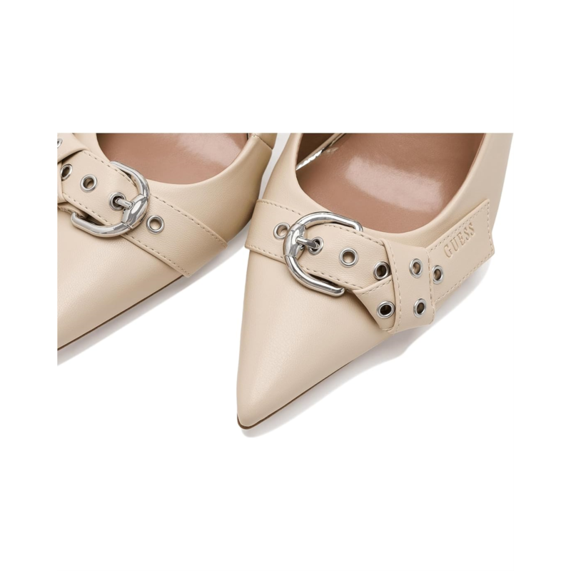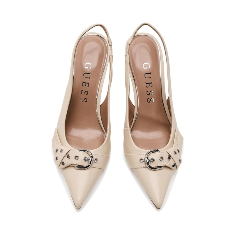 - Elevate your style with this chic GUESS Prissie slingback pump. Featuring a pointed toe, bold buckle detail with grommets, and a sleek stiletto heel, it blends modern edge with timeless sophistication-perfect for pairing with both office-ready looks and night-out ensembles.