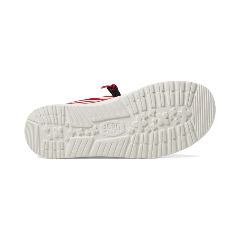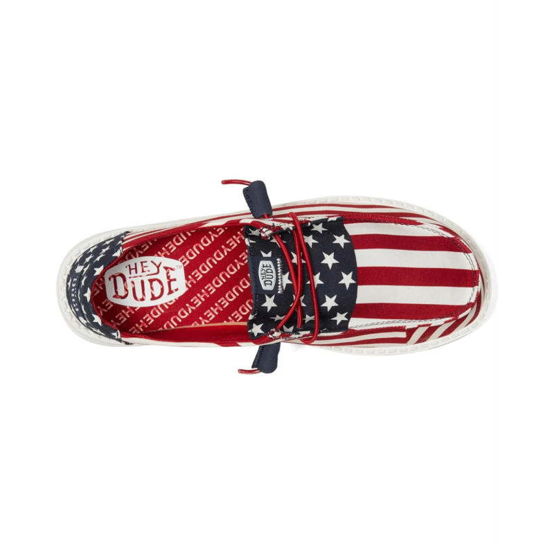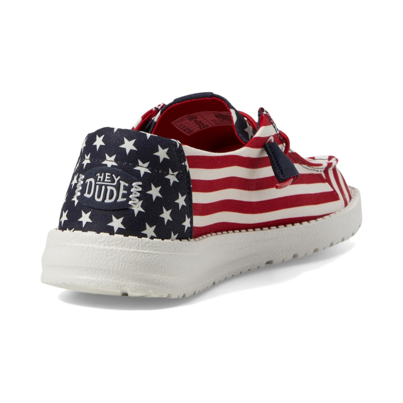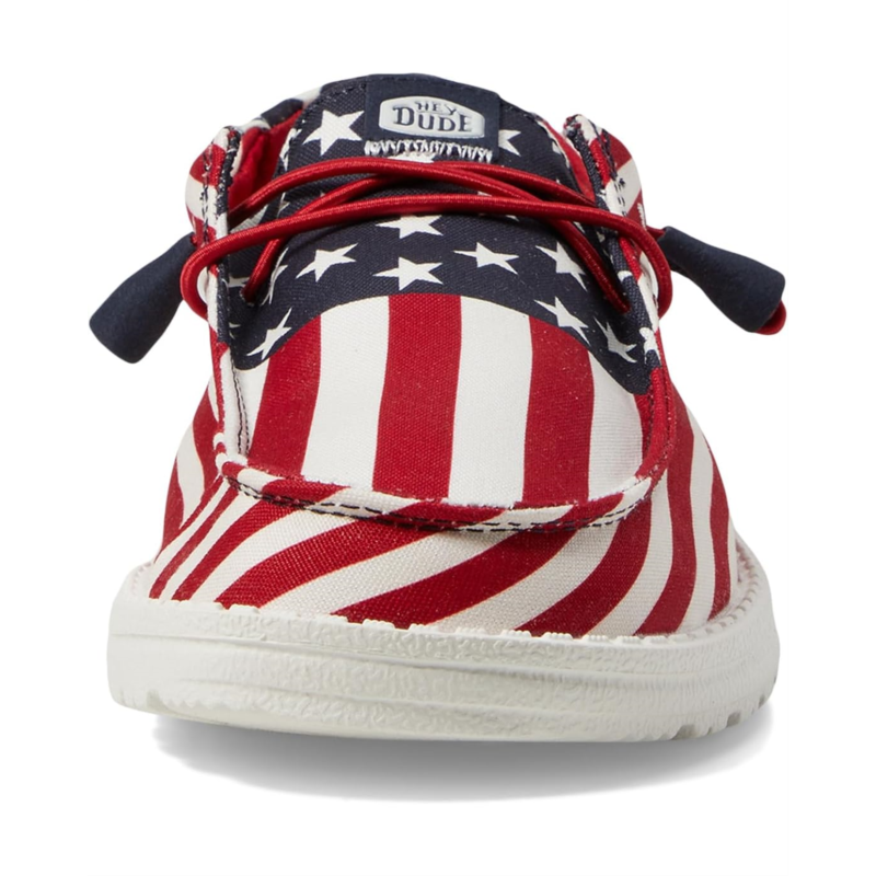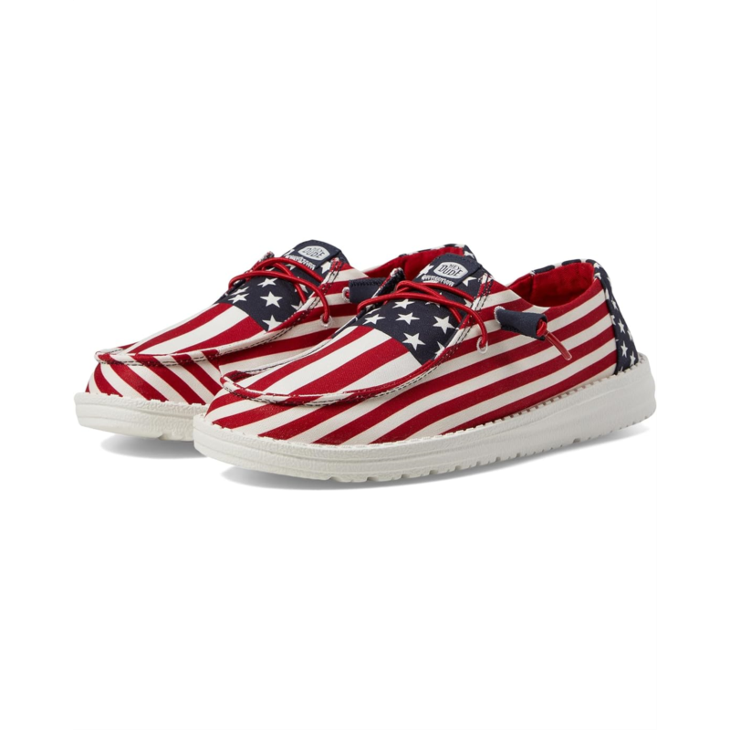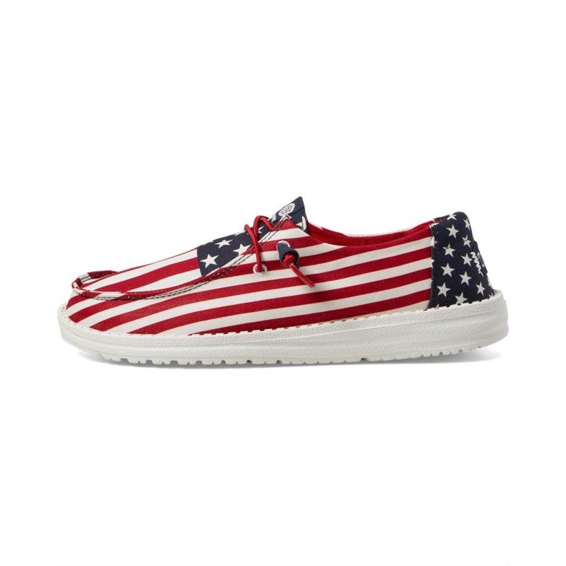 - Designed to accompany you anywhere you move, the Hey Dude Wendy Americana footwear is a casual pick for the season. Textile upper and textile lining make it super lightweight to support your ever-changing journey. It has rounded toe and Flex & Fold design that supports healthy feet with its unique shape giving complete freedom of movement. Manufactured using an elastic material that allows them to flex with the foot, resulting in a shoe that fits more uniformly. The removable memory foam cushioned insole provides maximum comfort and reduces sweating and odors.