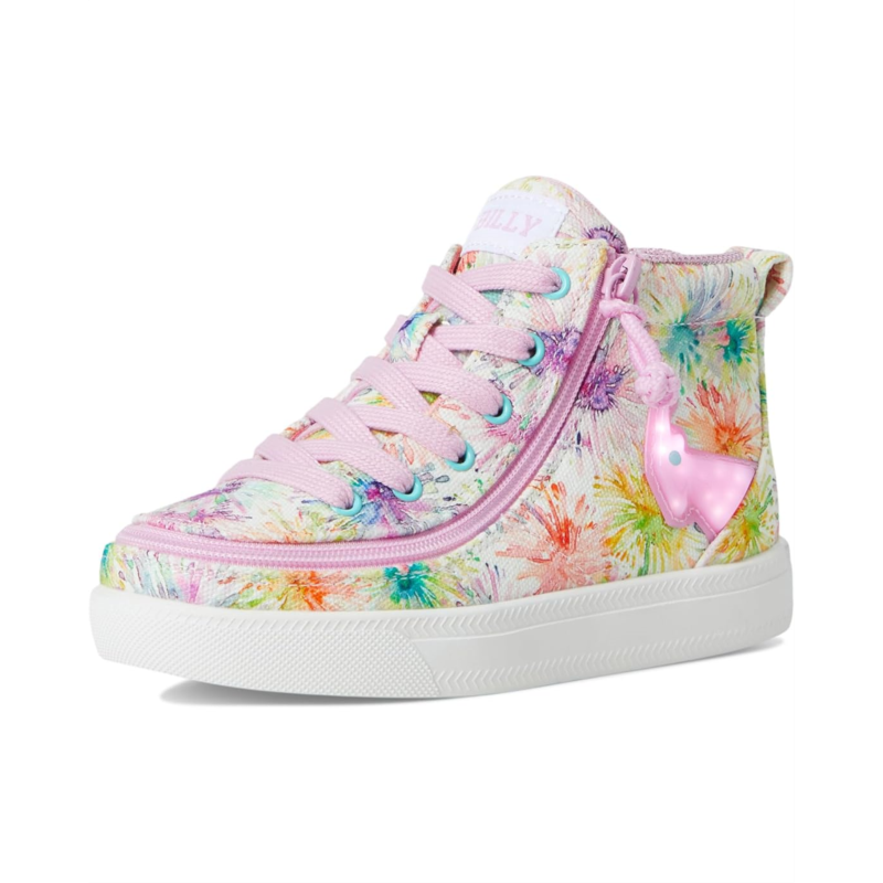 - The BILLY Footwear Kids Floral Light Ups shoe combines playful style with adaptive design for all-day comfort and ease. Featuring an adjustable lace system with a full-wrap zipper entry, these shoes offer quick access and a secure fit. The sensory-friendly cotton lining, complete with a zipper cover, ensures a smooth, irritation-free experience. Built with moderate cushioning and a neutral support profile, they are ideal for everyday wear.