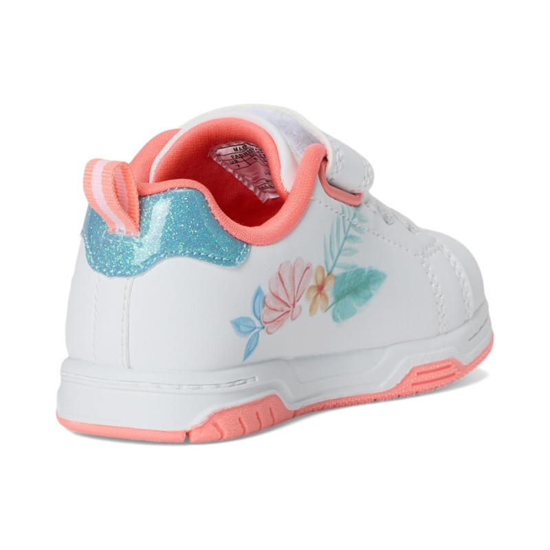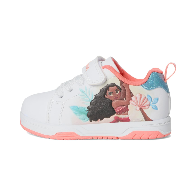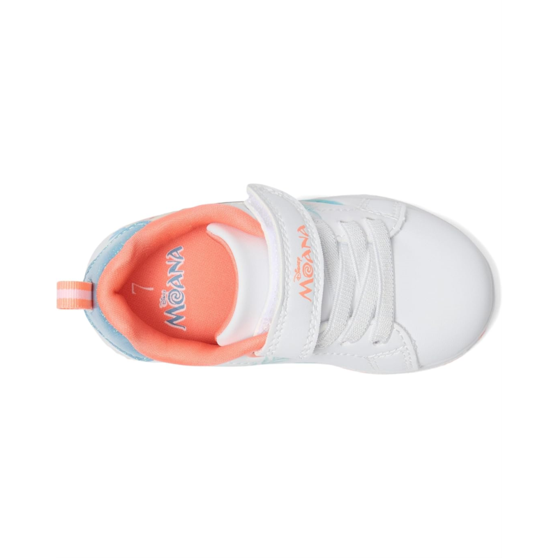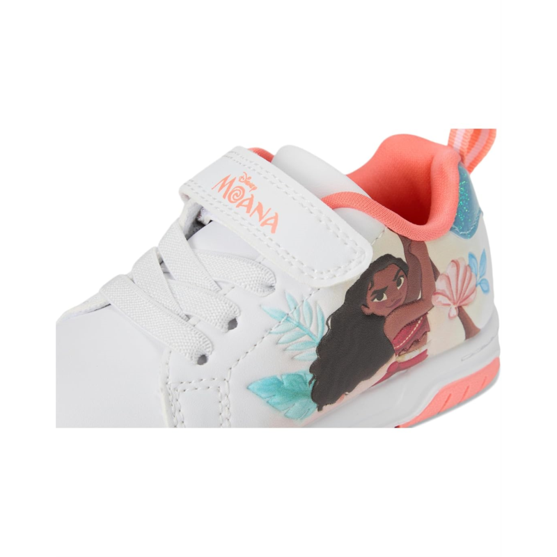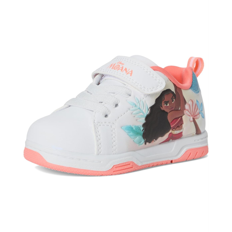 - Let her step into the spirit of the ocean sporting the Josmo Moana Sneaker, where tropical vibes meet all-day comfort. These charming kicks feature a shiny, easy-to-clean PU upper with bold Moana character art and colorful tropical icons thatll make her smile every time she looks down. The hook-and-loop strap with elasticized laces ensures a snug, secure fit thats perfect for on-the-go explorers, while the padded collar and tongue keep her comfy through every adventure. A durable synthetic rubber outsole adds stylish traction and support. Plus, the polyester lining and PU insole offer soft steps from sunrise to sunset.